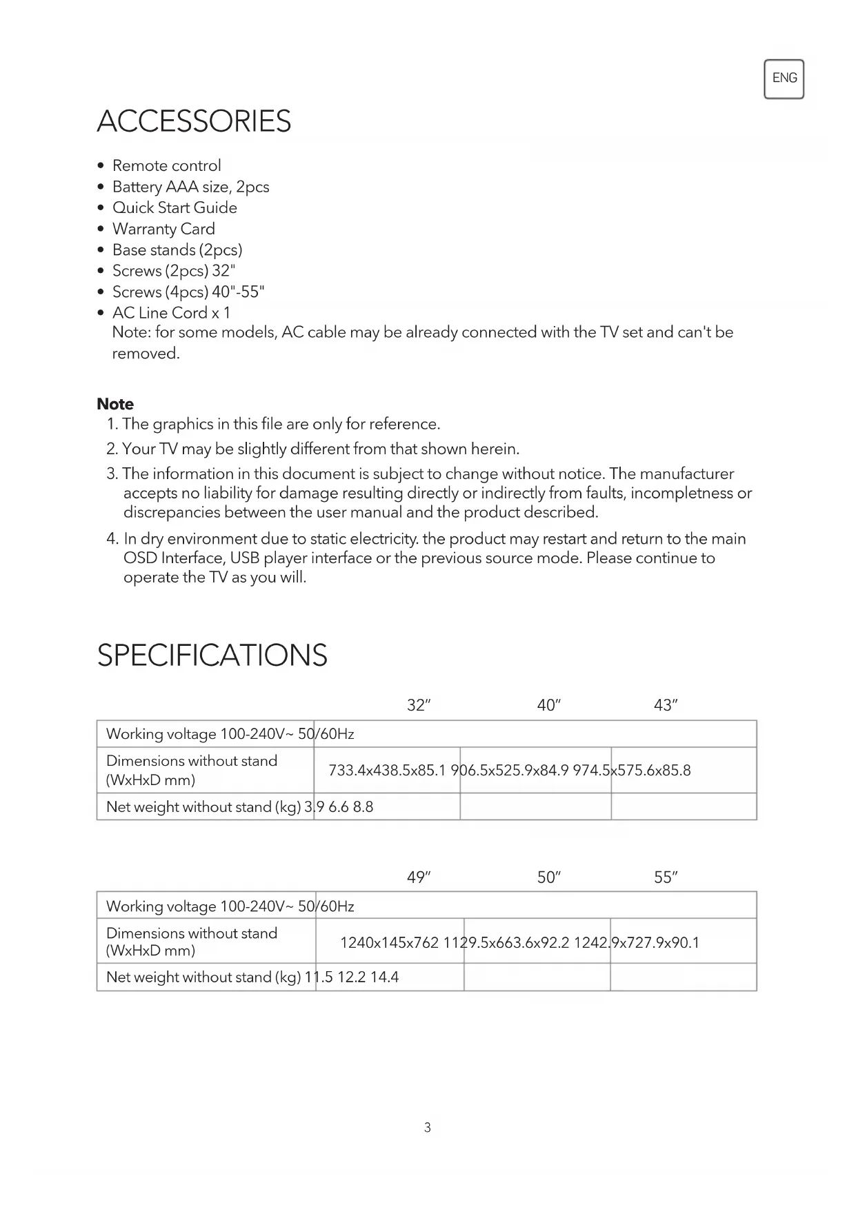 - AC Line Cord x 1 Note: for some models, AC cable may be already connected with the TV set and can't be removed. Note