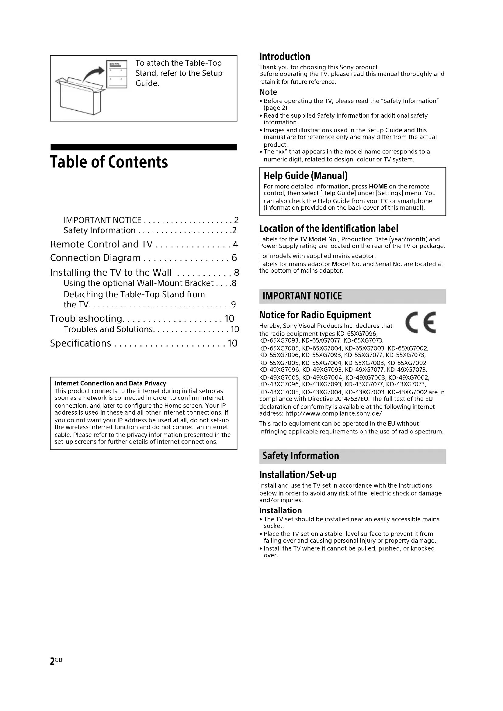 - Before operating the TV, please read the “Safety Information” (page 2).• Read the supplied Safety Information for additional safety information.• Images and illustrations used in the Setup Guide and this manual are for reference only and may differ from the actual product.• The “xx” that appears in the model name corresponds to a numeric digit, related to design, colour or TV system. Location of the identification label Labels for the TV Model No., Production Date (year/month) and Power Supply rating are located on the rear of the TV or package.For models with supplied mains adaptor:Labels for mains adaptor Model No. and Serial No. are located at the bottom of mains adaptor. IMPORTANT NOTICE Notice for Radio Equipment Hereby, Sony Visual Products Inc. declares that the radio equipment types KD-65XG7096, KD-65XG7093, KD-65XG7077, KD-65XG7073, KD-65XG7005, KD-65XG7004, KD-65XG7003, KD-65XG7002, KD-55XG7096, KD-55XG7093, KD-55XG7077, KD-55XG7073, KD-55XG7005, KD-55XG7004, KD-55XG7003, KD-55XG7002, KD-49XG7096, KD-49XG7093, KD-49XG7077, KD-49XG7073, KD-49XG7005, KD-49XG7004, KD-49XG7003, KD-49XG7002, KD-43XG7096, KD-43XG7093, KD-43XG7077, KD-43XG7073, KD-43XG7005, KD-43XG7004, KD-43XG7003, KD-43XG7002 are in compliance with Directive 2014/53/EU. The full text of the EU declaration of conformity is available at the following internet address: http://www.compliance.sony.de/This radio equipment can be operated in the EU without infringing applicable requirements on the use of radio spectrum. Safety Information Installation/Set-up Install and use the TV set in accordance with the instructions below in order to avoid any risk of fire, electric shock or damage and/or injuries. Installation