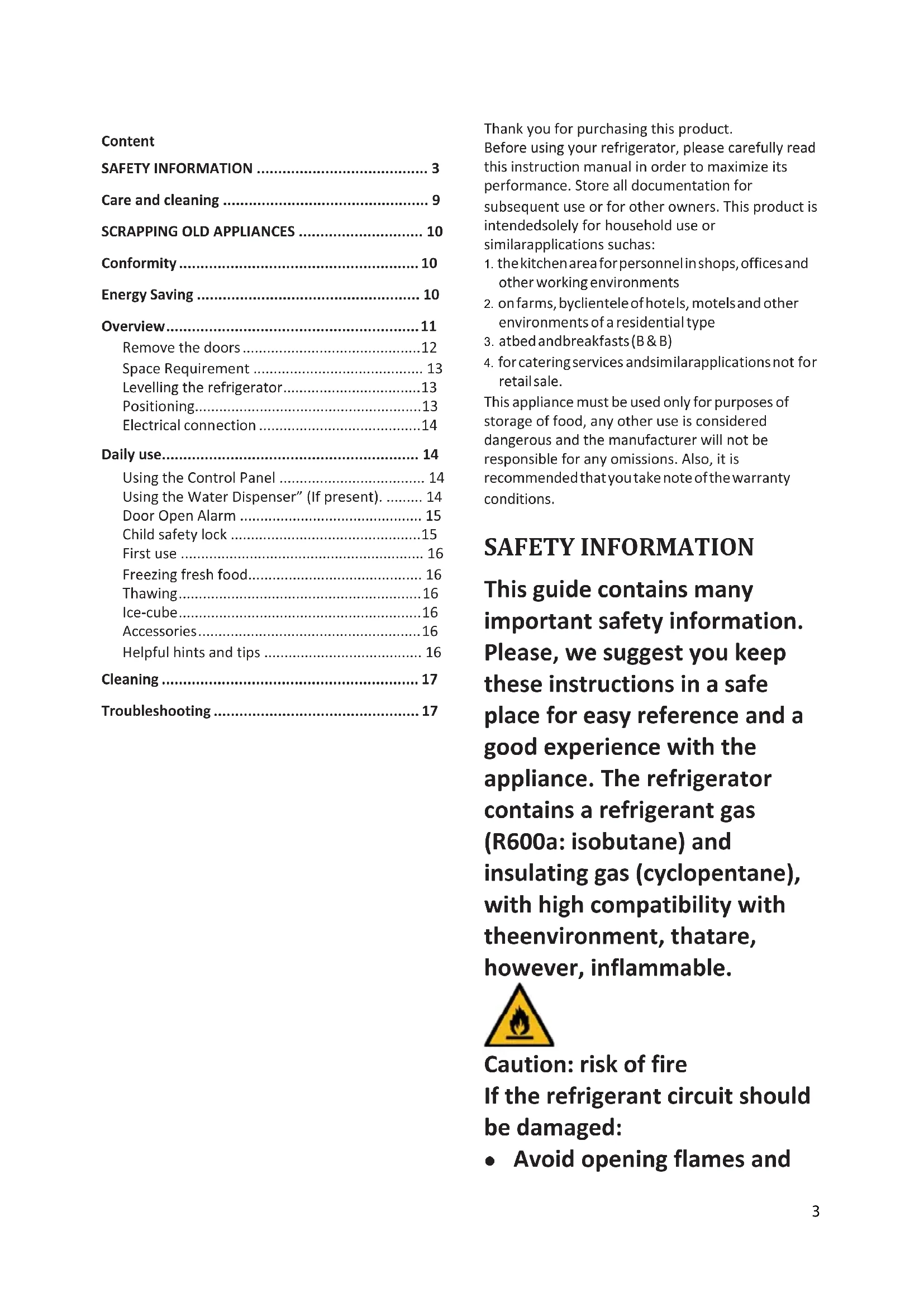 retail sale. This appliance must be used only for purposes of storage of food, any other use is considered dangerous and the manufacturer will not be responsible for any omissions. Also, it is recommended that you take note of the warranty conditions. SAFETY INFORMATION This guide contains many important safety information. Please, we suggest you keep these instructions in a safe place for easy reference and a good experience with the appliance. The refrigerator contains a refrigerant gas (R600a: isobutane) and insulating gas (cyclopentane), with high compatibility with theenvironment, thatare, however, inflammable. Caution: risk of fire If the refrigerant circuit should be damaged: