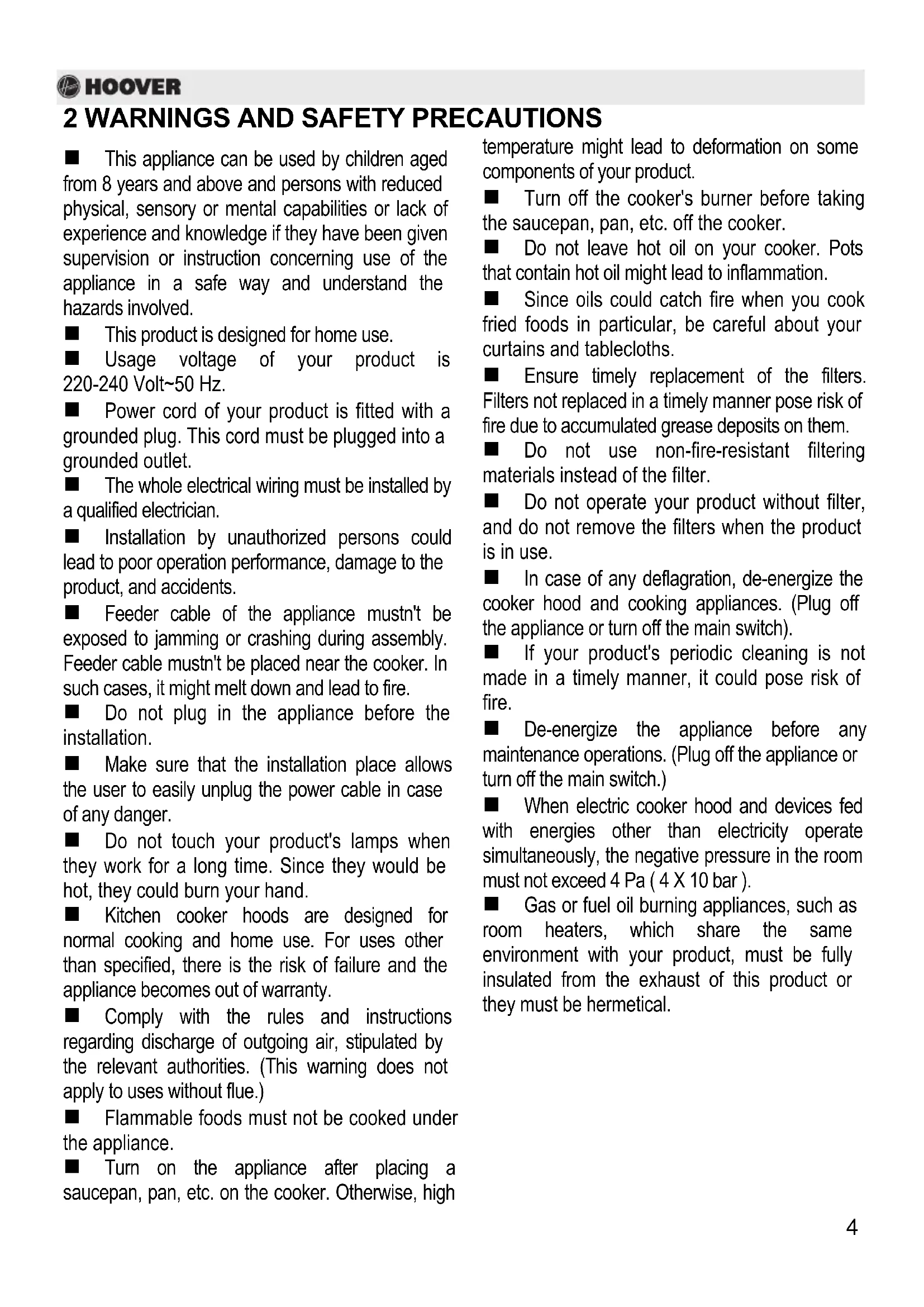 This appliance can be used by children aged from 8 years and above and persons with reduced physical, sensory or mental capabilities or lack of experience and knowledge if they have been given supervision or instruction concerning use of the appliance in a safe way and understand the hazards involved. This product is designed for home use. Usage voltage of your product is 220-240 Volt~50 Hz. Power cord of your product is fitted with a grounded plug. This cord must be plugged into a grounded outlet. The whole electrical wiring must be installed by a qualified electrician. Installation by unauthorized persons could lead to poor operation performance, damage to the product, and accidents. Feeder cable of the appliance mustn't be exposed to jamming or crashing during assembly. Feeder cable mustn't be placed near the cooker. In such cases, it might melt down and lead to fire. Do not plug in the appliance before the installation. Make sure that the installation place allows the user to easily unplug the power cable in case of any danger. Do not touch your product's lamps when they work for a long time. Since they would be hot, they could burn your hand. Kitchen cooker hoods are designed for normal cooking and home use. For uses other than specified, there is the risk of failure and the appliance becomes out of warranty. Comply with the rules and instructions regarding discharge of outgoing air, stipulated by the relevant authorities. (This warning does not apply to uses without flue.) Flammable foods must not be cooked under the appliance. Turn on the appliance after placing a saucepan, pan, etc. on the cooker. Otherwise, high temperature might lead to deformation on some components of your product. Turn off the cooker's burner before taking the saucepan, pan, etc. off the cooker. Do not leave hot oil on your cooker. Pots that contain hot oil might lead to inflammation. Since oils could catch fire when you cook fried foods in particular, be careful about your curtains and tablecloths. Ensure timely replacement of the filters. Filters not replaced in a timely manner pose risk of fire due to accumulated grease deposits on them. Do not use non-fire-resistant filtering materials instead of the filter. Do not operate your product without filter, and do not remove the filters when the product is in use. In case of any deflagration, de-energize the cooker hood and cooking appliances. (Plug off the appliance or turn off the main switch). If your product's periodic cleaning is not made in a timely manner, it could pose risk of fire. De-energize the appliance before any maintenance operations. (Plug off the appliance or turn off the main switch.) When electric cooker hood and devices fed with energies other than electricity operate simultaneously, the negative pressure in the room must not exceed 4 Pa ( 4 X 10 bar ). Gas or fuel oil burning appliances, such as room heaters, which share the same environment with your product, must be fully insulated from the exhaust of this product or they must be hermetical.4