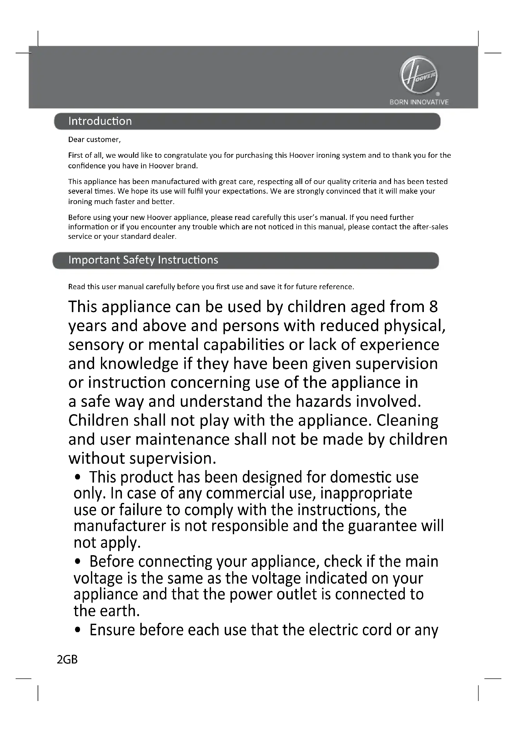 First of all, we would like to congratulate you for purchasing this Hoover ironing system and to thank you for the confidence you have in Hoover brand.