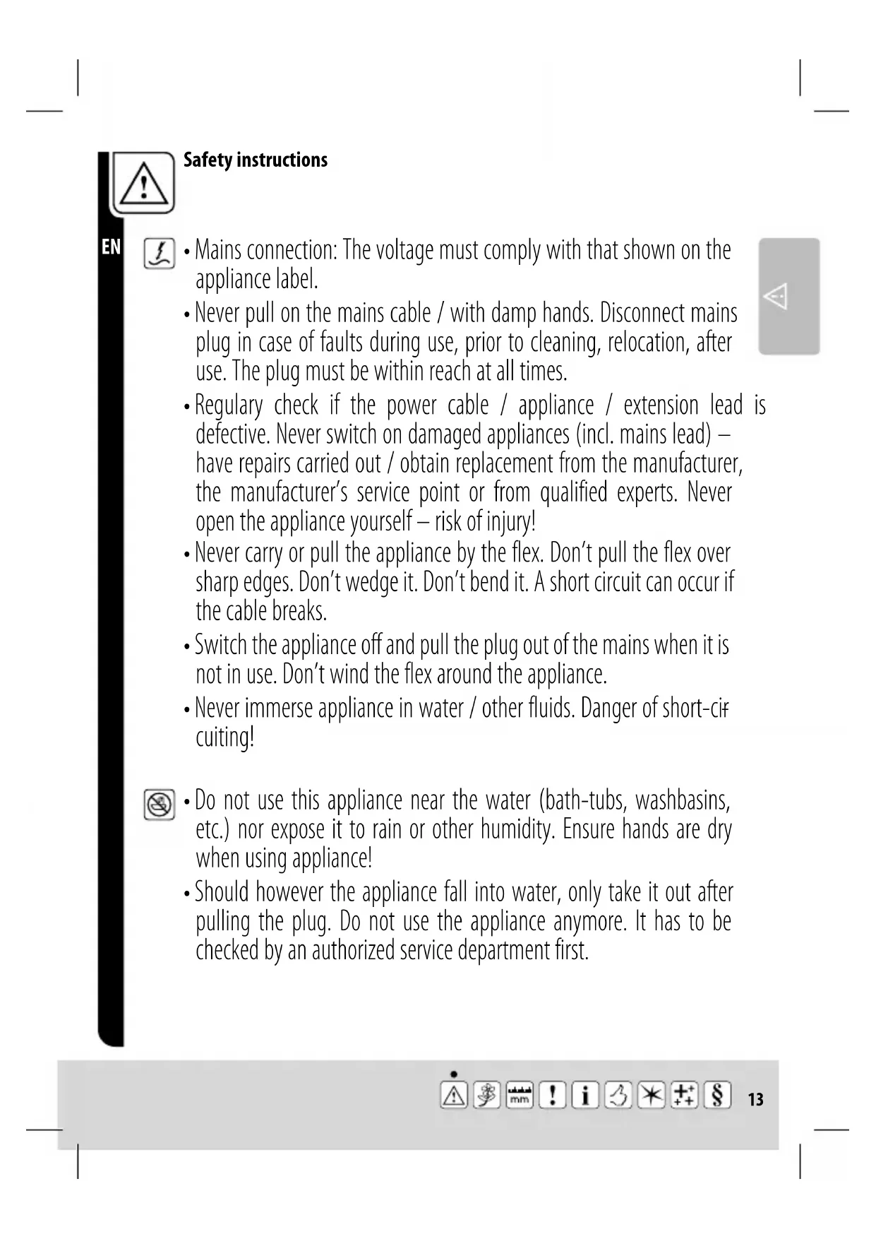- Do not use this appliance near the water (bath-tubs, washbasins, etc.) nor expose it to rain or other humidity. Ensure hands are dry when using appliance!14 Safety instructions