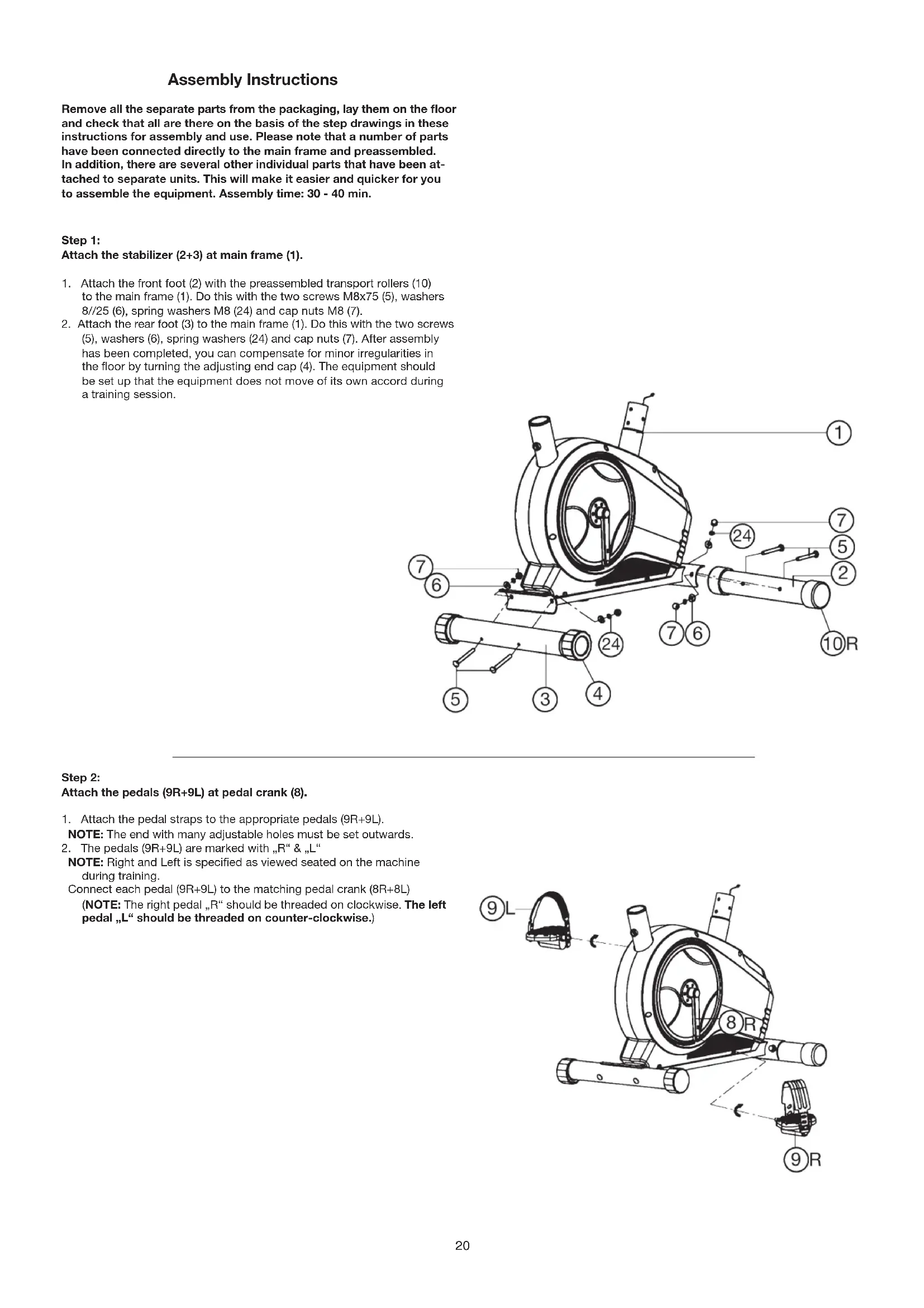 (5), washers (6), spring washers (24) and cap nuts (7). After assembly has been completed, you can compensate for minor irregularities in the floor by turning the adjusting end cap (4). The equipment should be set up that the equipment does not move of its own accord during a training session. Step 2: Attach the pedals (9R+9L) at pedal crank (8).