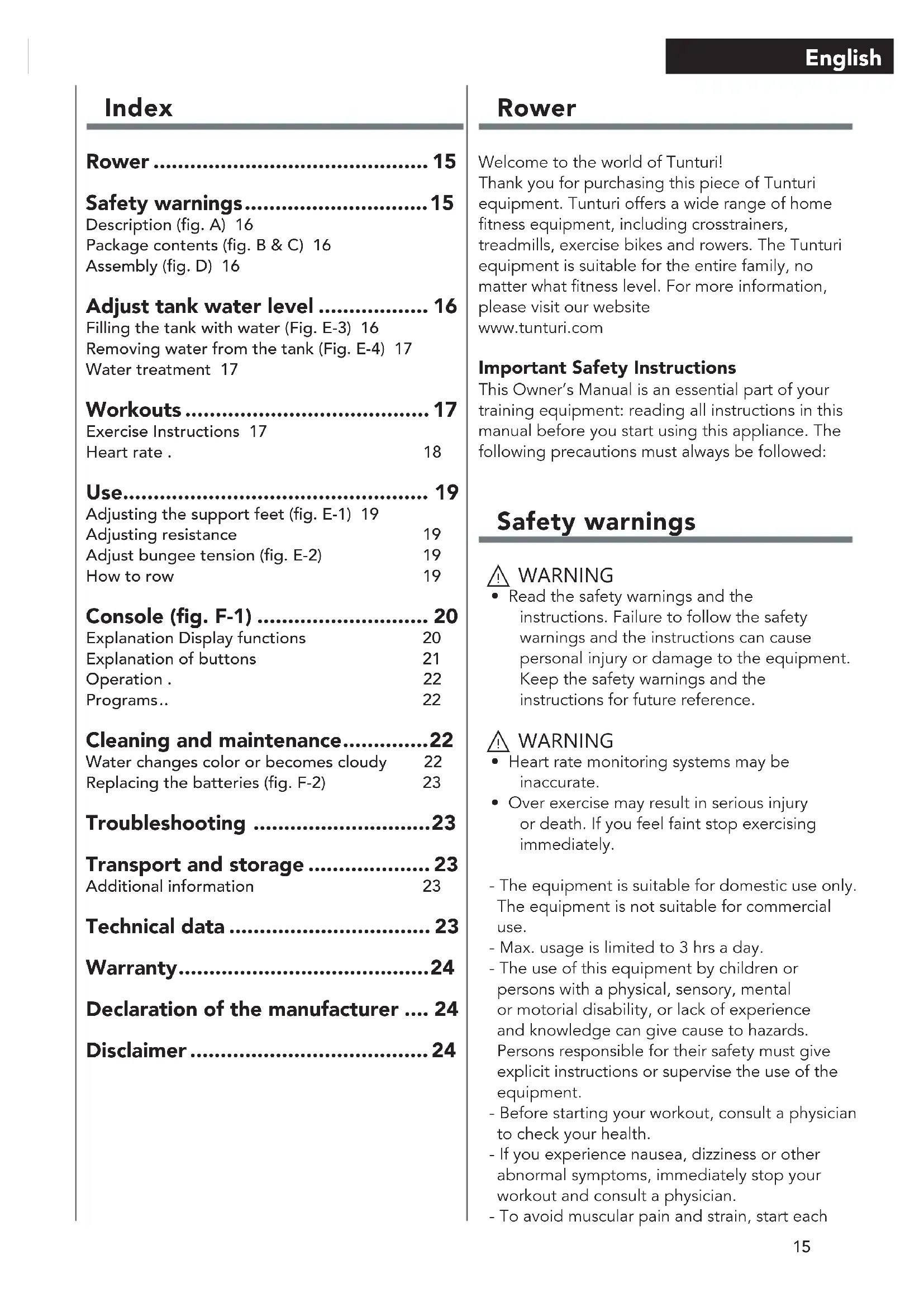 - Over exercise may result in serious injury or death. If you feel faint stop exercising immediately. - The equipment is suitable for domestic use only. The equipment is not suitable for commercial use. - Max. usage is limited to 3 hrs a day. - The use of this equipment by children or persons with a physical, sensory, mental or motorial disability, or lack of experience and knowledge can give cause to hazards. Persons responsible for their safety must give explicit instructions or supervise the use of the equipment. - Before starting your workout, consult a physician to check your health. - If you experience nausea, dizziness or other abnormal symptoms, immediately stop your workout and consult a physician. - To avoid muscular pain and strain, start each Index Rower ............................................. 15 Safety warnings .............................. 15 Description (g. A) 16 Package contents (g. B & C) 16 Assembly (g. D) 16 Adjust tank water level .................. 16 Filling the tank with water (Fig. E-3) 16 Removing water from the tank (Fig. E-4) 17 Water treatment 17 Workouts ........................................ 17 Exercise Instructions 17 Heart rate . 18 Use.................................................. 19 Adjusting the support feet (g. E-1) 19 Adjusting resistance 19 Adjust bungee tension (g. E-2) 19 How to row 19 Console (g. F-1) ............................ 20 Explanation Display functions 20 Explanation of buttons 21 Operation . 22 Programs . . 22 Cleaning and maintenance .............. 22 Water changes color or becomes cloudy 22 Replacing the batteries (g. F-2) 23 Troubleshooting ............................. 23 Transport and storage .................... 23 Additional information 23 Technical data ................................. 23 Warranty ......................................... 24 Declaration of the manufacturer .... 24 Disclaimer ....................................... 2416 English workout by warming up and finish each workout by cooling down. Remember to stretch at the end of the workout. - The equipment is suitable for indoor use only. The equipment is not suitable for outdoor use. - Only use the equipment in environments with adequate ventilation. Do not use the equipment in draughty environments in order not to catch a cold. - Only use the equipment in environments with ambient temperatures between 10 °C and 35 °C. Only store the equipment in environments with ambient temperatures between 5 °C and 45 °C. - Do not use or store the equipment in humid surroundings. The air humidity must never be more than 80%. - Only use the equipment for its intended purpose. Do not use the equipment for other purposes than described in the manual. - Do not use the equipment if any part is damaged or defective. If a part is damaged or defective, contact your dealer. - Keep your hands, feet and other body parts away from the moving parts. - Keep your hair away from the moving parts. - Wear appropriate clothing and shoes. - Keep clothing, jewellery and other objects away from the moving parts. - Make sure that only one person uses the equipment at a time. The equipment must not be used by persons weighing more than 150 kg (330 lbs). - Do not open equipment without consulting your dealer. Description (fig. A) Your rower is a piece of stationary fitness equipment used to simulate rowing without causing excessive pressure to the joints. Package contents (fig. B & C) - The package contains the parts as shown in fig. B. - The package contains the fasteners as shown in fig. C. Refer to the section “Description” ‼ NOTE