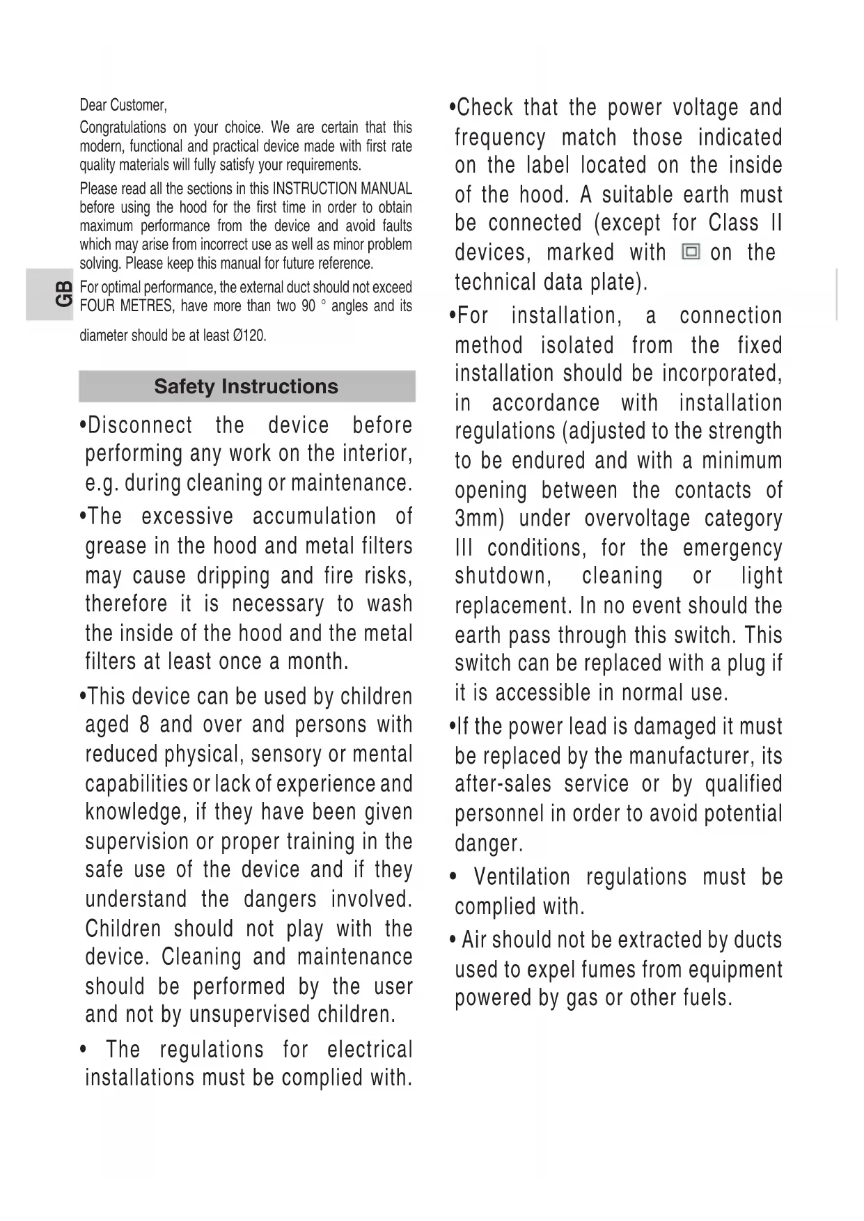 - Air should not be extracted by ducts used to expel fumes from equipment powered by gas or other fuels. Safety InstructionsGB