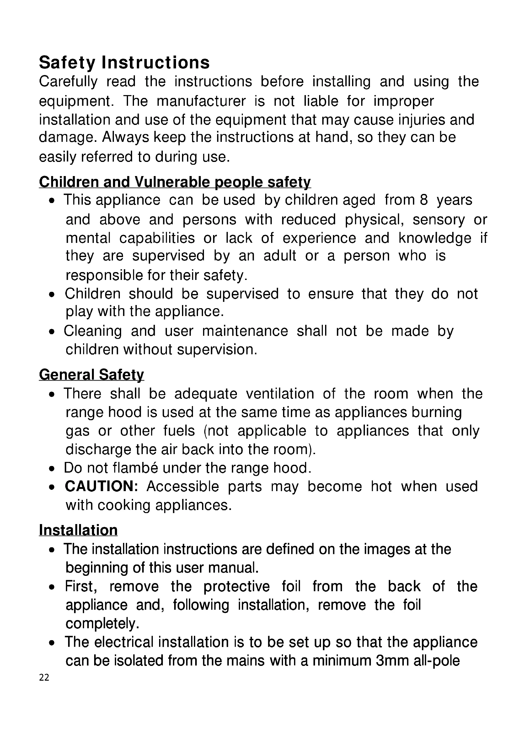 OUTLET. This appliance is not intended for use by young children or infirm persons without supervision. Young children should be supervised to ensure that they do not play with the appliance. We recommend that the appliance is connected by a qualified electrician, who is a member of the N.I.C.E.I.C. and who will comply with the I.E.E. and local regulations. Should the colour of the wires in the mains lead for the appliance not correspond with the coloured markings identifying the terminal in your spur box proceed as follows: The wire which is coloured blur must be connected to the marked N (Neutral) or coloured Black. The wire which is coloured brown must be connected to the marked L (Live) or couloured Red Where avialable (see installation), the wire which is coloured yellow/green must be connected to the market ⊥ or coloured Yellow/Green. If the cooker hood is installed for use above a gas appliance then the provision vor ventilation must be in accordance with the Gas Safety (Installation & Use) Regulations 1984 and the relevant Building Regulations. Detailed recommendations are contained in the following British Standard Codes of Practice BS6172, BS5440 and BS6891 Current Edition.28 Saving Energy This appliance is energy-efficient but there are some tips on how to save even more energy: