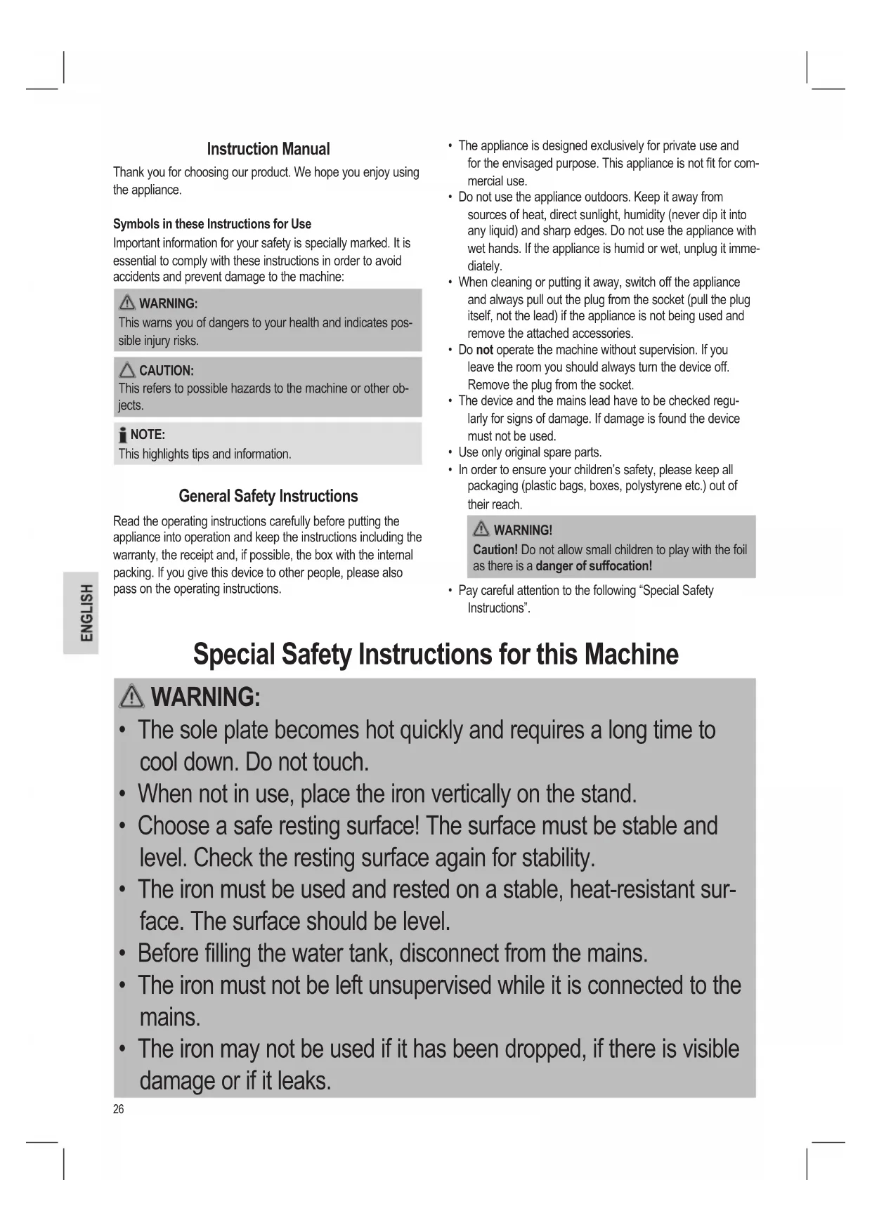 - Pay careful attention to the following “Special Safety Instructions”. Instruction Manual Thank you for choosing our product. We hope you enjoy using the appliance. Symbols in these Instructions for Use Important information for your safety is specially marked. It is essential to comply with these instructions in order to avoid accidents and prevent damage to the machine:
