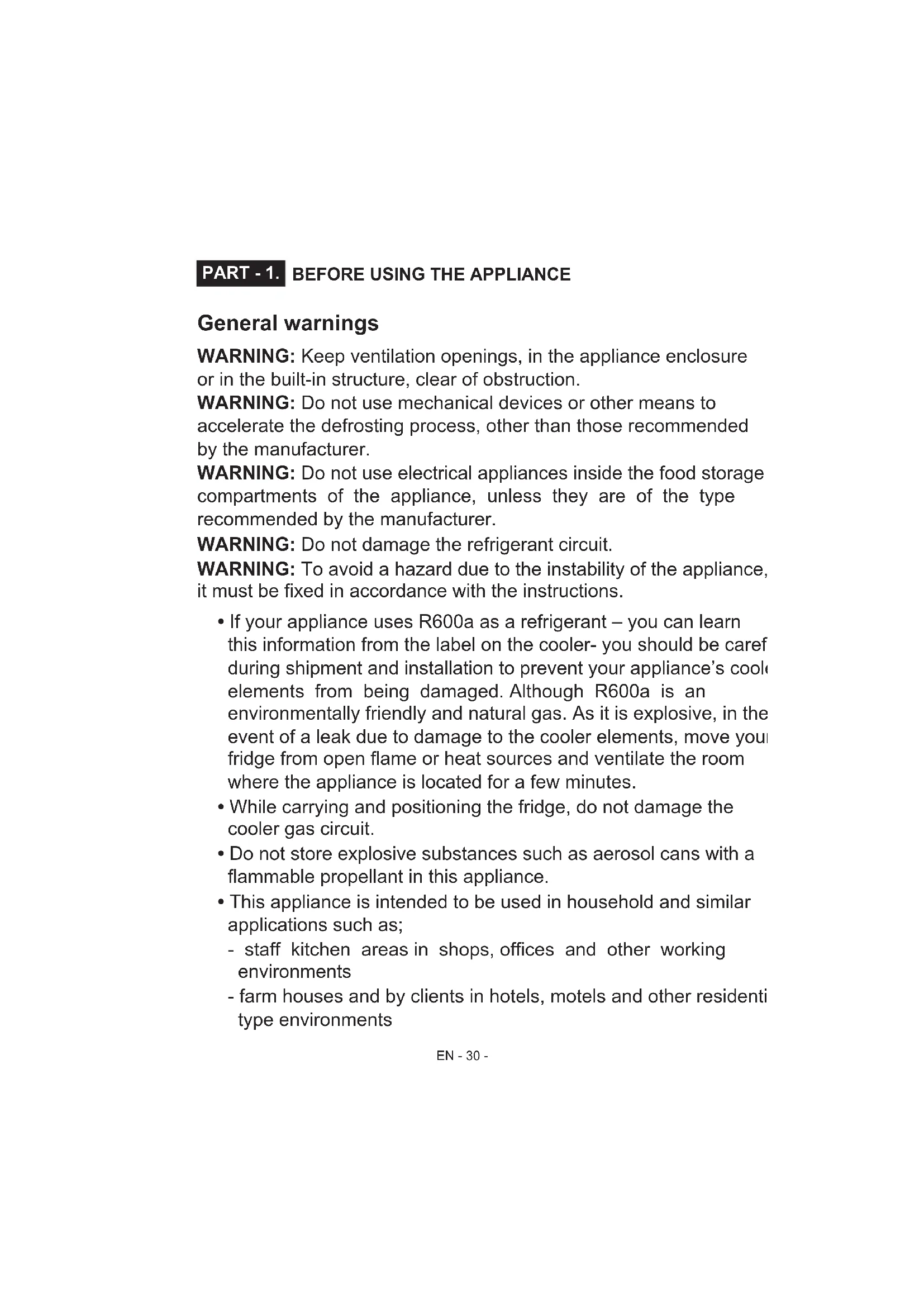 - This appliance is produced to be used in houses and it is only suitable for cooling / storing foods. It is not suitable for commercial or common use and/or for storing substances except for food. Our company is not responsible for the losses to be occurred in the contrary case.EN - 33 -