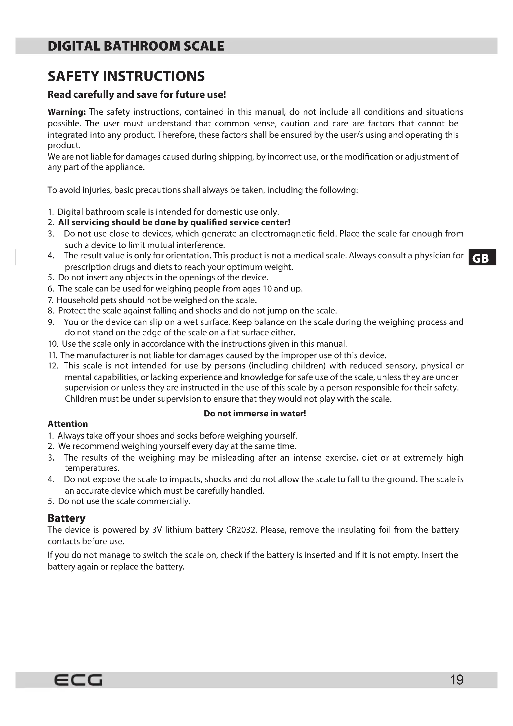 - Digital bathroom scale is intended for domestic use only.