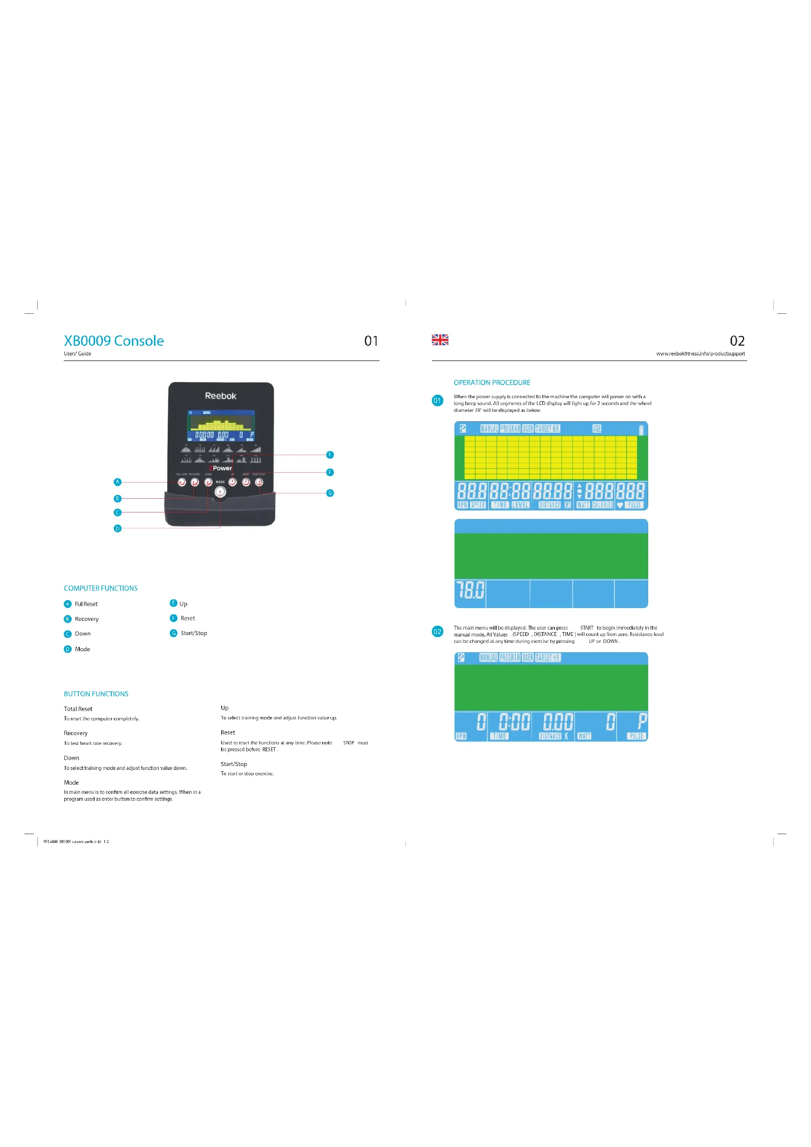 Seat set 1reebokfitness.info RFE 4846 XB0009 console guide.indd 1-1 ZPower Console Guide www.reebokfitness.info0201 www.reebokfitness.info/productsupport XB0009 Console Users’ Guide OPERATION PROCEDURE When the power supply is connected to the machine the computer will power on with a long beep sound. All segments of the LCD display will light up for 2 seconds and the wheel diameter 78” will be displayed as below. BUTTON FUNCTIONS Total Reset To reset the computer completely. Recovery To test heart rate recovery. Down To select training mode and adjust function value down. Mode In main menu is to confirm all exercise data settings. When in a program used as enter button to confirm settings. To select training mode and adjust function value up. Reset Used to reset the functions at any time. Please note STOP must be pressed before RESET . Start/Stop To start or stop exercise. The main menu will be displayed. The user can press START to begin immediately in the manual mode. All Values (SPEED , DISTANCE , TIME ) will count up from zero. Resistance level can be changed at any time during exercise by pressing UP or DOWN .