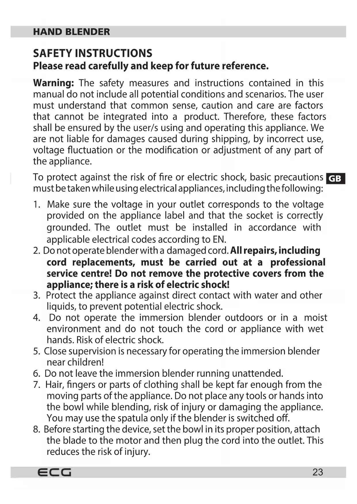Wrapping paper and corrugated paperboard – deliver to scrapyard. Packing foil, PE bags, plastic elements – throw into plastic recycling containers. DISPOSAL OF PRODUCTS AT THE END OF LIFETIME Disposal of electric and electronic equipment (valid in EU member countries and other European countries with an implemented recycling system)The represented symbol on the product or package means the product shall not be treated as domestic waste. Hand over the product to the specied location for recycling electric and electronic equipment. Prevent negative impacts on human health and the environment by properly recycling your product.Recycling contributes to preserving natural resources. For more information on the recycling of this product, refer to your local authority, domestic waste processing organization or store, where you purchased the product. This product complies with EU directive requirements on electromagnetic compatibility and electrical safety. The instruction manual is available at website www.ecg-electro.eu. Changes in text and technical parameters reserved. 08/05ŠTAPNI MIKSER