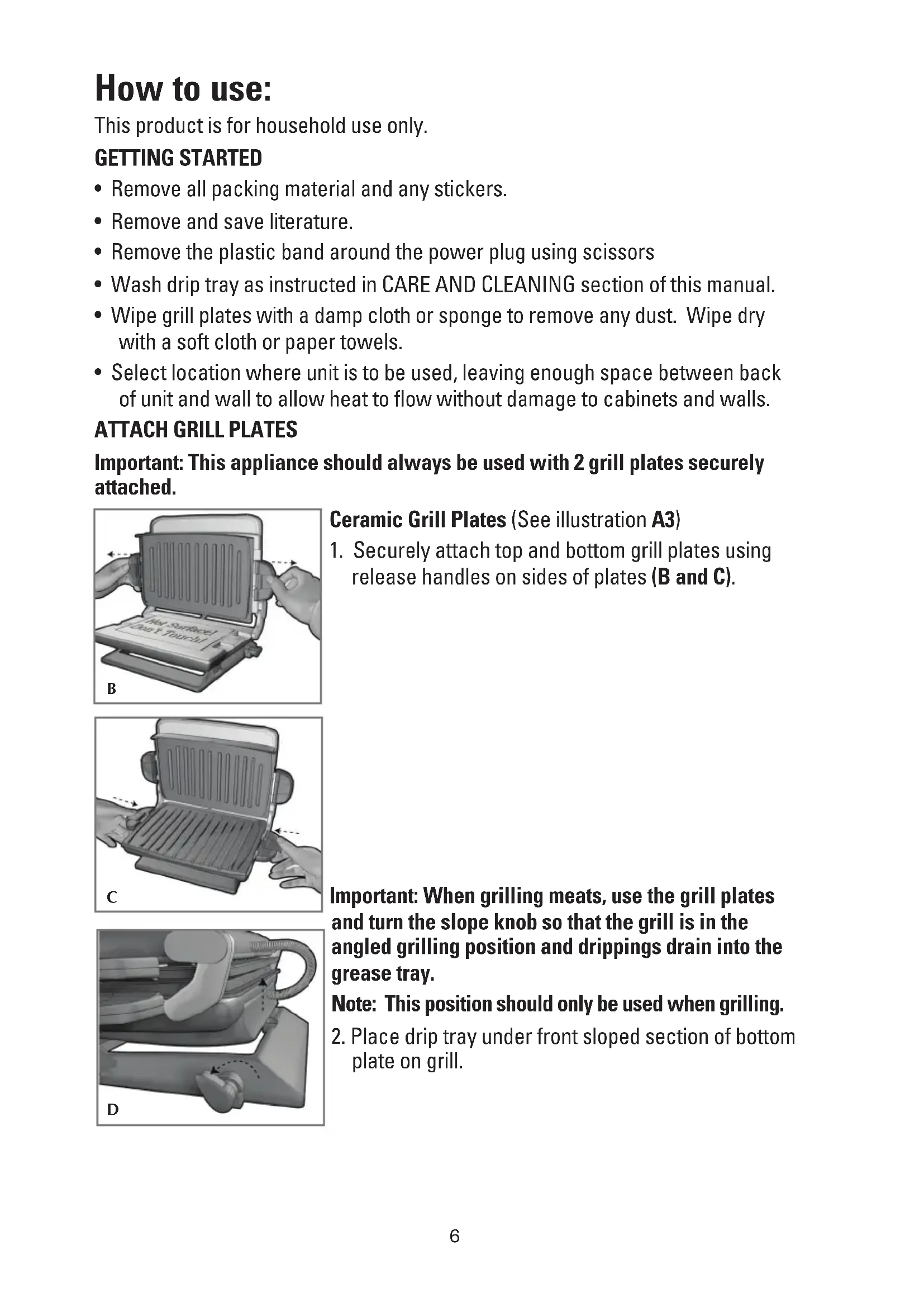 WAFFLE PLATES (See illustration A3) Important: When using these plates, make sure bottom plate is in a completely horizontal position (see illustration D, pg 6).