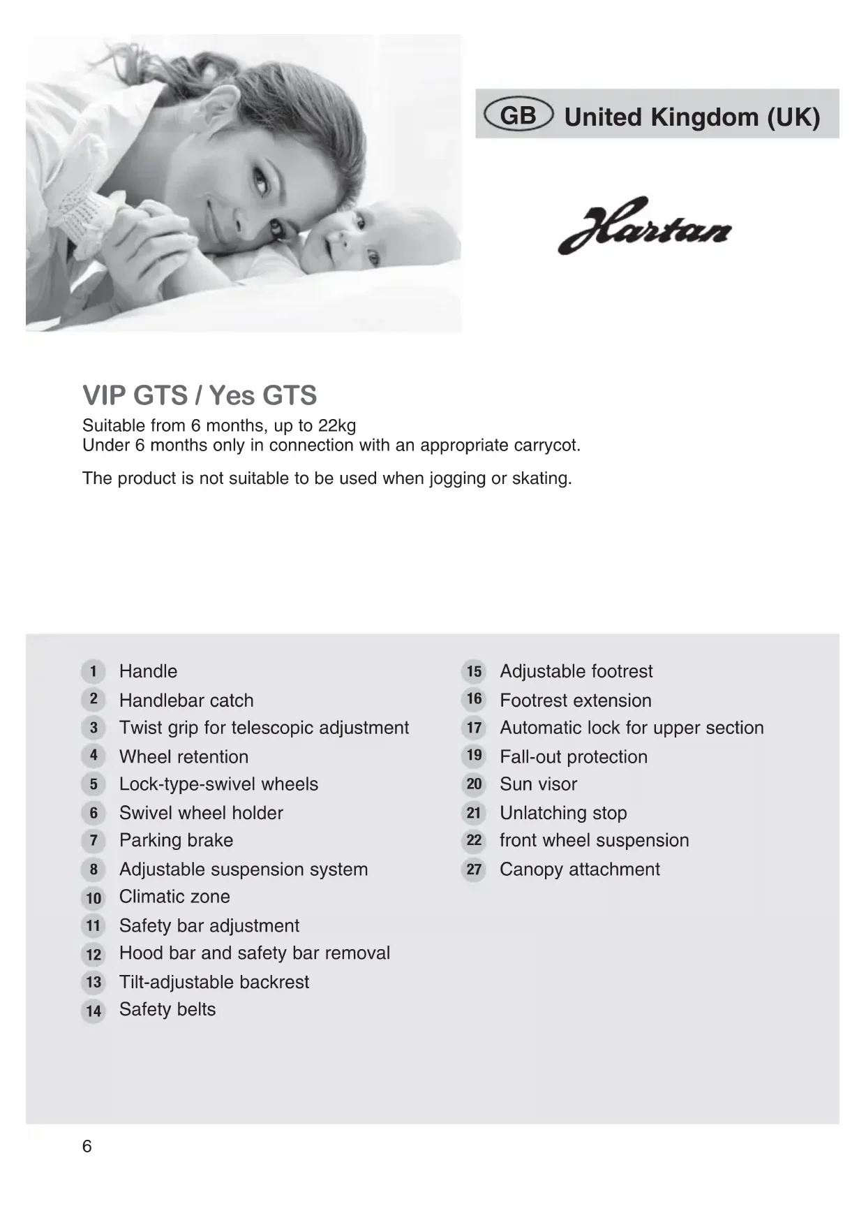 VIP GTS / Yes GTS Suitable from 6 months, up to 22kg Under 6 months only in connection with an appropriate carrycot. The product is not suitable to be used when jogging or skating. Handle Handlebar catch Twist grip for telescopic adjustment Wheel retention Lock-type-swivel wheels Swivel wheel holder Parking brake Adjustable suspension system Climatic zone Safety bar adjustment Hood bar and safety bar removal Tilt-adjustable backrest Safety belts Adjustable footrest Footrest extension Automatic lock for upper section Fall-out protection Sun visor Unlatching stop front wheel suspension Canopy attachment