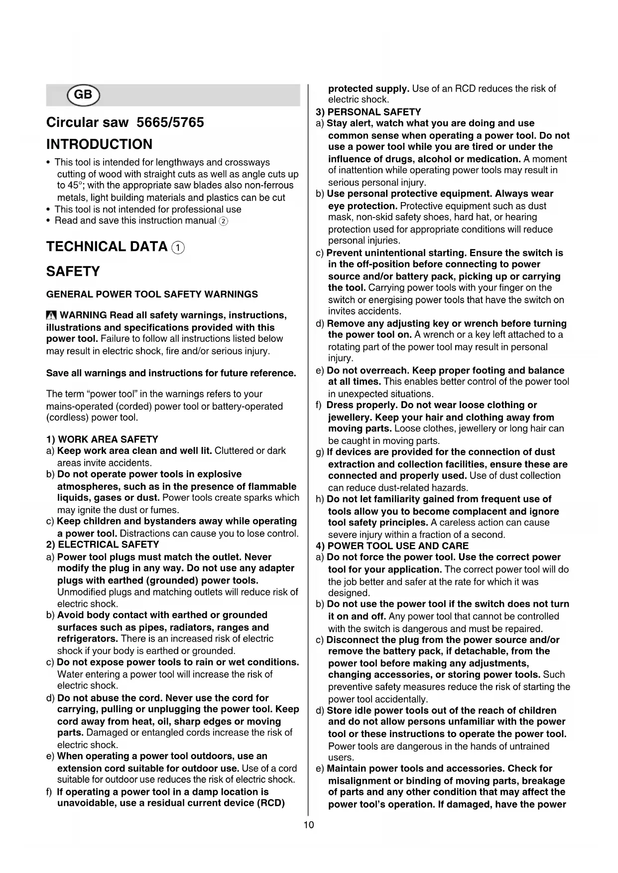 - Operating the tool 9 - connect plug to power source - always hold handle S rmly with one hand and handle T rmly with the other hand - place tool with front end of foot at on workpiece ! ensure that the saw teeth are not engaged into the workpiece - switch on tool by rst pressing knob V (= safety switch which cannot be locked) and then pulling trigger W ! the tool should run at full speed before the blade enters into the workpiece - lower guard F opens automatically when saw blade enters the workpiece (open lower guard manually by using lever G only for special cuts such as plunge cuts) ! do not force the tool (apply light and continuous pressure in order to avoid overheating the blade tips and, in case of cutting plastics, melting the plastic material) ! while working, always hold the tool at the grey-coloured grip area(s) - after completing the cut switch o tool by releasing trigger W ! ensure that the blade has come to a complete standstill, before you lift the tool from the workpiece APPLICATION ADVICE