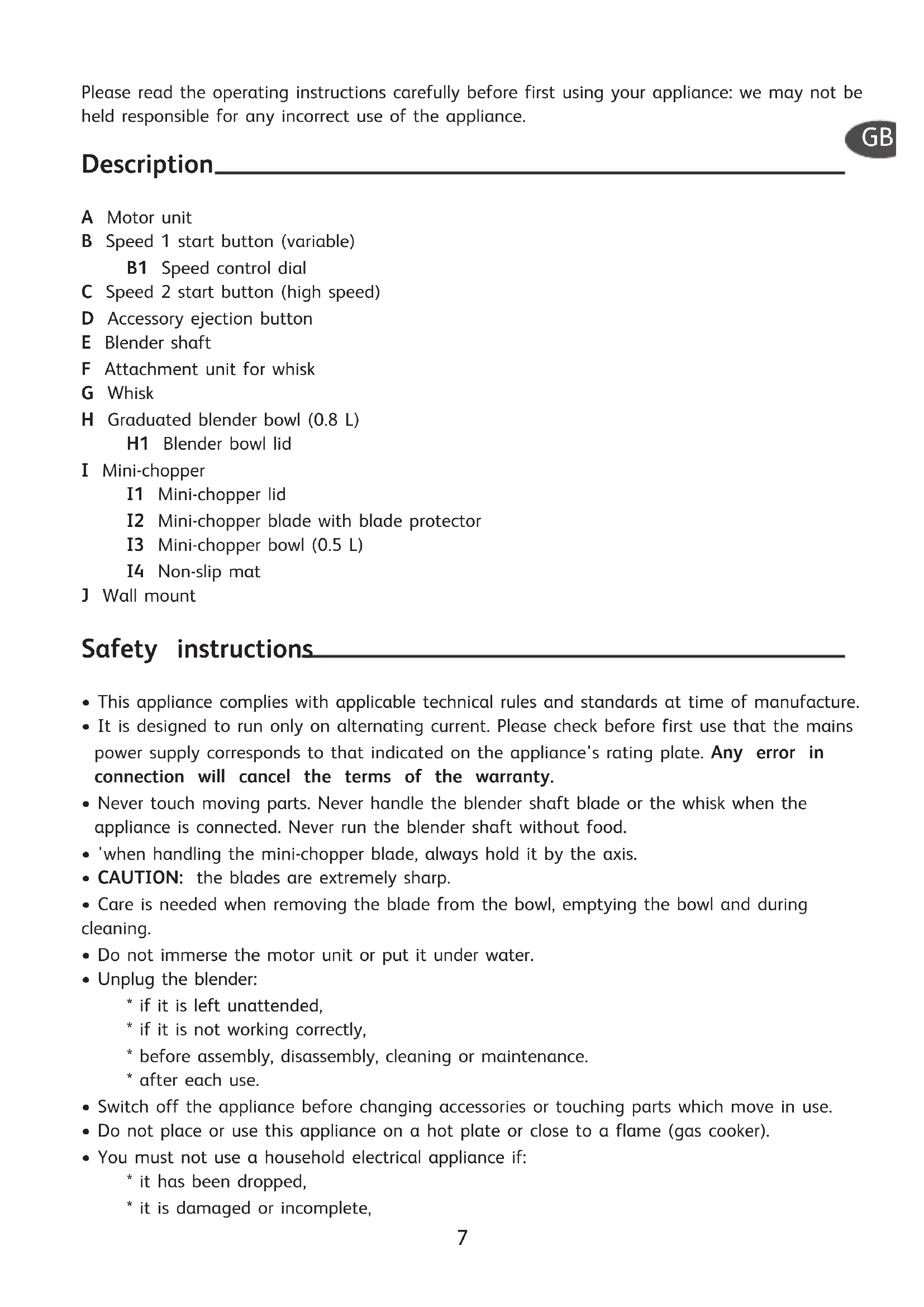 - Never touch moving parts. Never handle the blender shaft blade or the whisk when the appliance is connected. Never run the blender shaft without food.