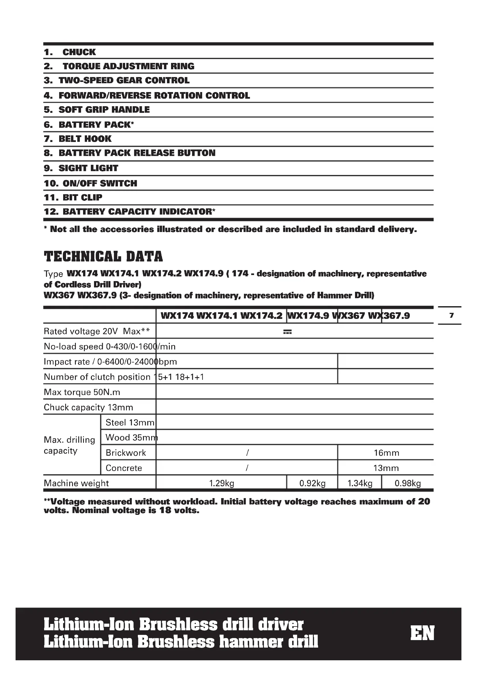 TECHNICAL DATA Type WX174 WX174.1 WX174.2 WX174.9 ( 174 - designation of machinery, representative of Cordless Drill Driver) WX367 WX367.9 (3- designation of machinery, representative of Hammer Drill) WX174 WX174.1 WX174.2 WX174.9 WX367 WX367.9 Rated voltage 20V Max** No-load speed 0-430/0-1600/min Impact rate / 0-6400/0-24000bpm Number of clutch position 15+1 18+1+1 Max torque 50N.m Chuck capacity 13mm Max. drilling capacity Steel 13mm Wood 35mm Brickwork / 16mm Concrete / 13mm Machine weight 1.29kg 0.92kg 1.34kg 0.98kg **Voltage measured without workload. Initial battery voltage reaches maximum of 20 volts. Nominal voltage is 18 volts.