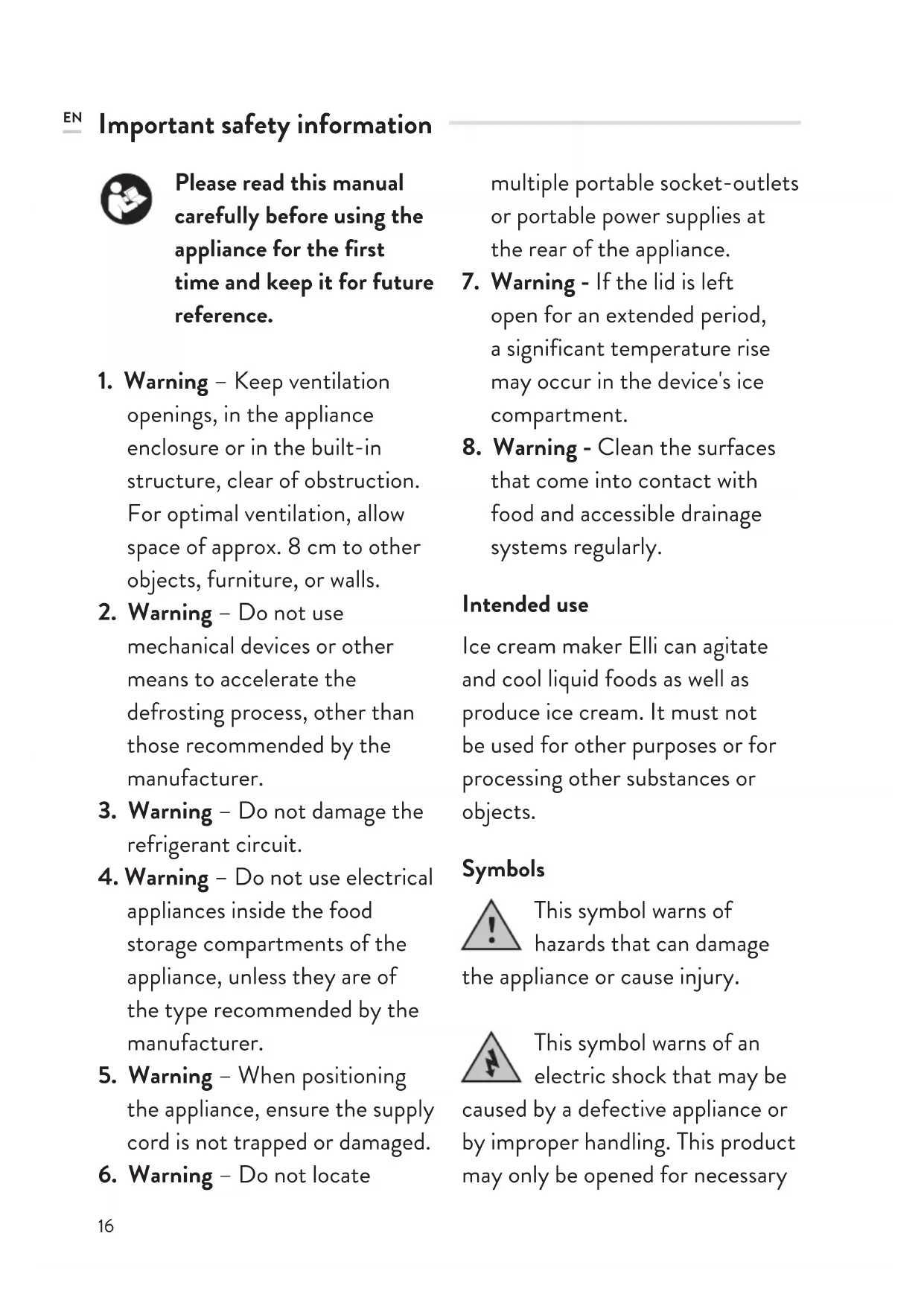 Ice cream maker Elli can agitate and cool liquid foods as well as produce ice cream. It must not be used for other purposes or for processing other substances or objects.