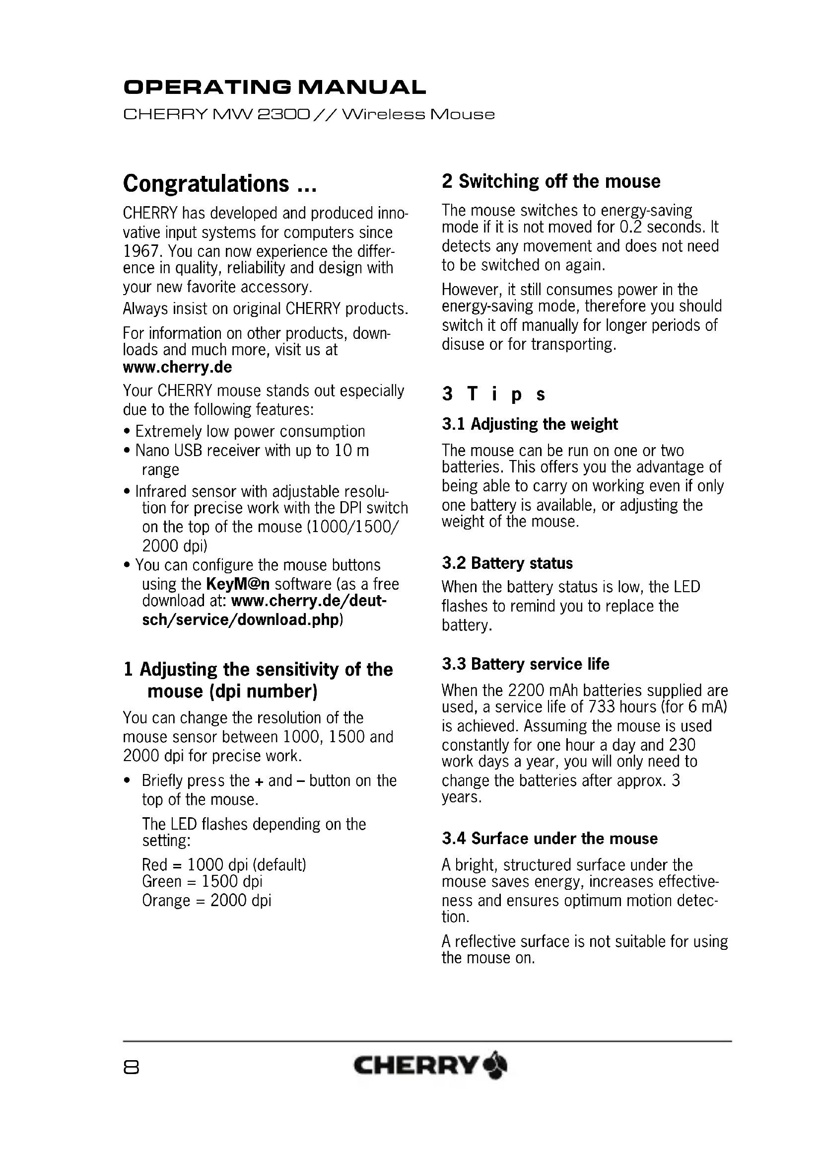 A bright, structured surface under the mouse saves energy, increases effective- ness and ensures optimum motion detec- tion. A reflective surface is not suitable for using the mouse on. OPERATING MANUAL CHERRY MW 2300 // Wireless Mouse9