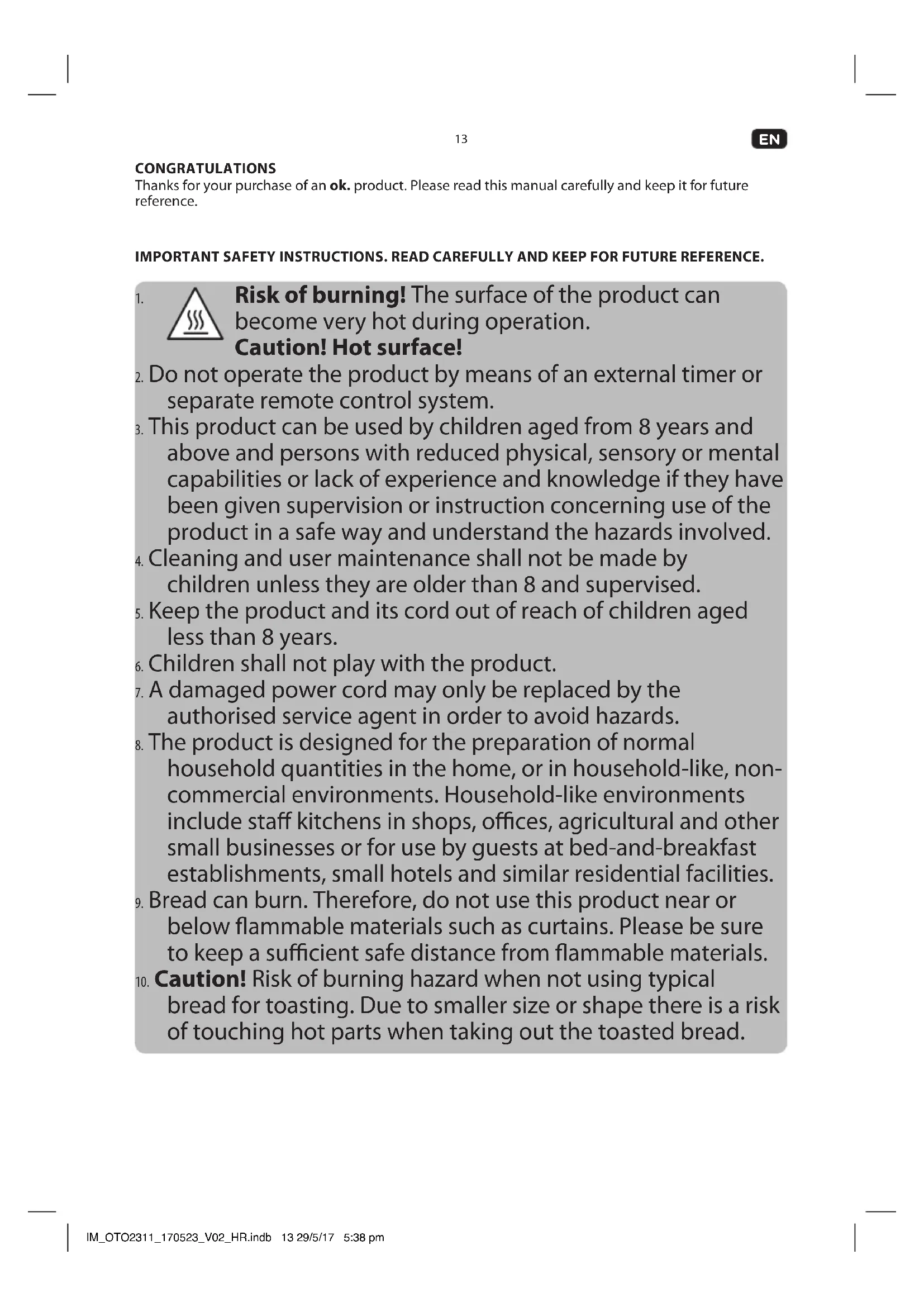 - Caution! Risk of burning hazard when not using typical bread for toasting. Due to smaller size or shape there is a risk of touching hot parts when taking out the toasted bread.