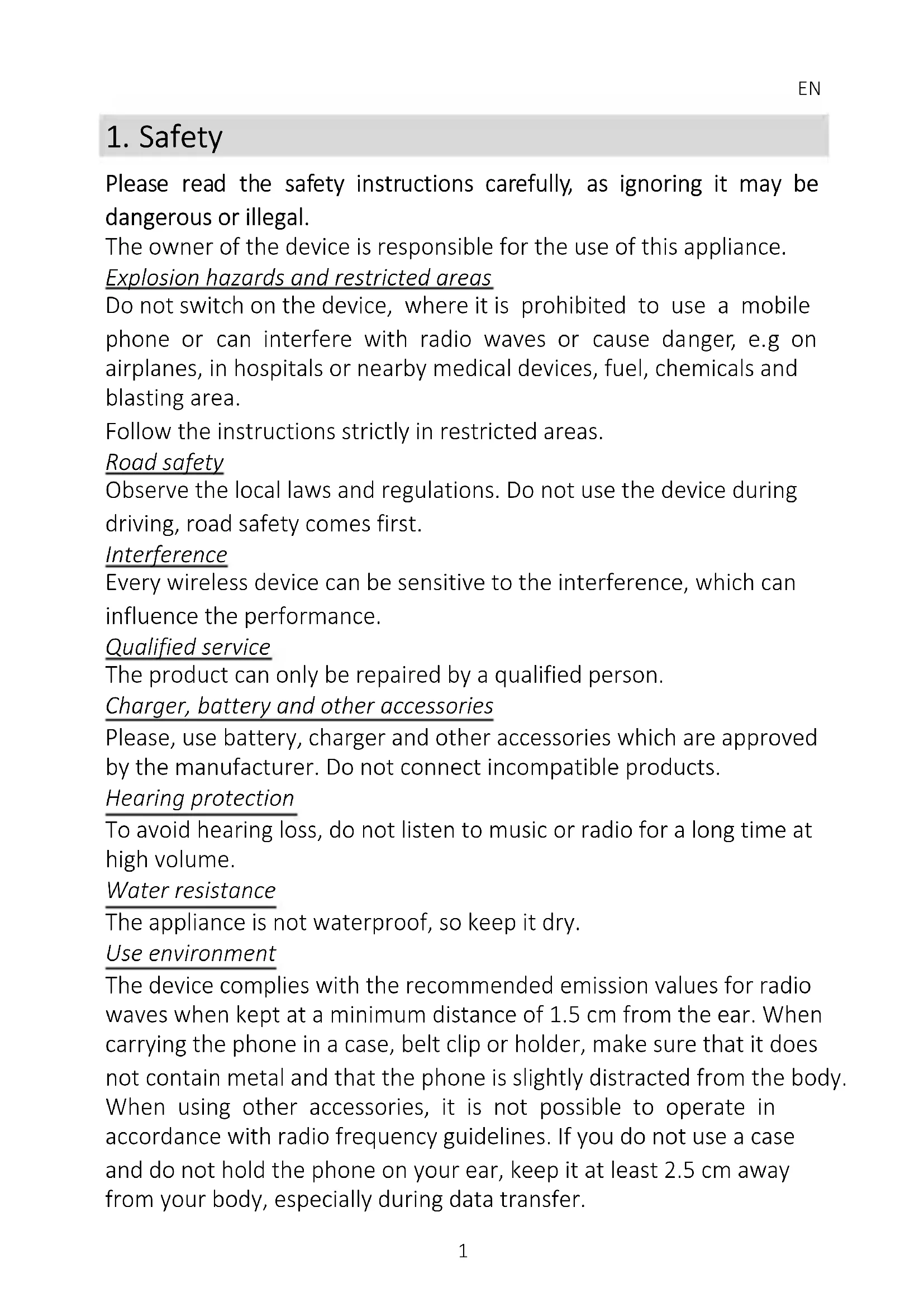 Please read the safety instructions carefully, as ignoring it may be dangerous or illegal. The owner of the device is responsible for the use of this appliance. Explosion hazards and restricted areas Do not switch on the device, where it is prohibited to use a mobile phone or can interfere with radio waves or cause danger, e.g on airplanes, in hospitals or nearby medical devices, fuel, chemicals and blasting area. Follow the instructions strictly in restricted areas. Road safety Observe the local laws and regulations. Do not use the device during driving, road safety comes first. Interference Every wireless device can be sensitive to the interference, which can influence the performance. Qualified service The product can only be repaired by a qualified person. Charger, battery and other accessories Please, use battery, charger and other accessories which are approved by the manufacturer. Do not connect incompatible products. Hearing protection To avoid hearing loss, do not listen to music or radio for a long time at high volume. Water resistance The appliance is not waterproof, so keep it dry. Use environment The device complies with the recommended emission values for radio waves when kept at a minimum distance of 1.5 cm from the ear. When carrying the phone in a case, belt clip or holder, make sure that it does not contain metal and that the phone is slightly distracted from the body. When using other accessories, it is not possible to operate in accordance with radio frequency guidelines. If you do not use a case and do not hold the phone on your ear, keep it at least 2.5 cm away from your body, especially during data transfer.EN