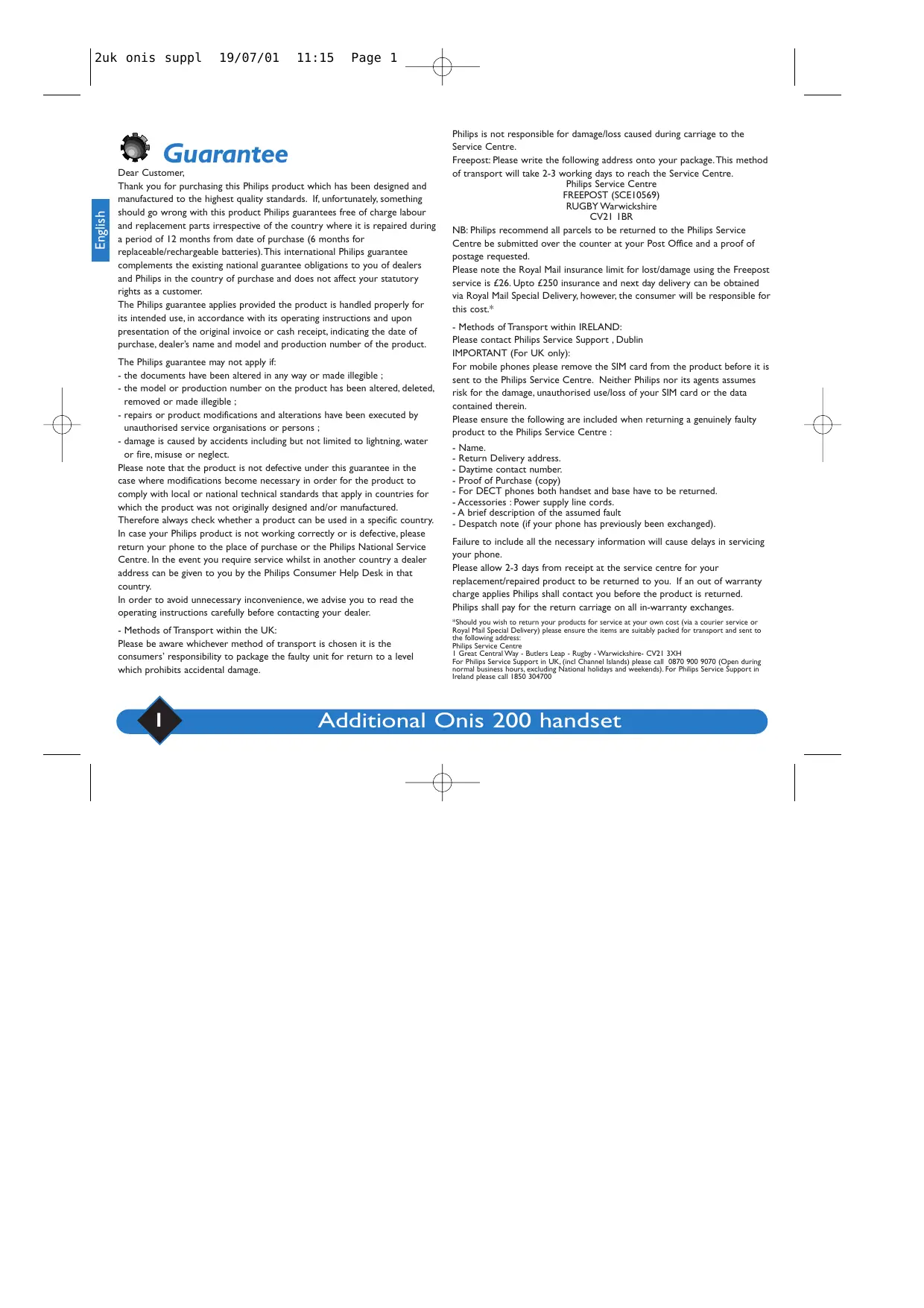 Thank you for purchasing this Philips product which has been designed and manufactured to the highest quality standards. If, unfortunately, something should go wrong with this product Philips guarantees free of charge labour and replacement parts irrespective of the country where it is repaired during a period of 12 months from date of purchase (6 months for replaceable/rechargeable batteries). This international Philips guarantee complements the existing national guarantee obligations to you of dealers and Philips in the country of purchase and does not affect your statutory rights as a customer.