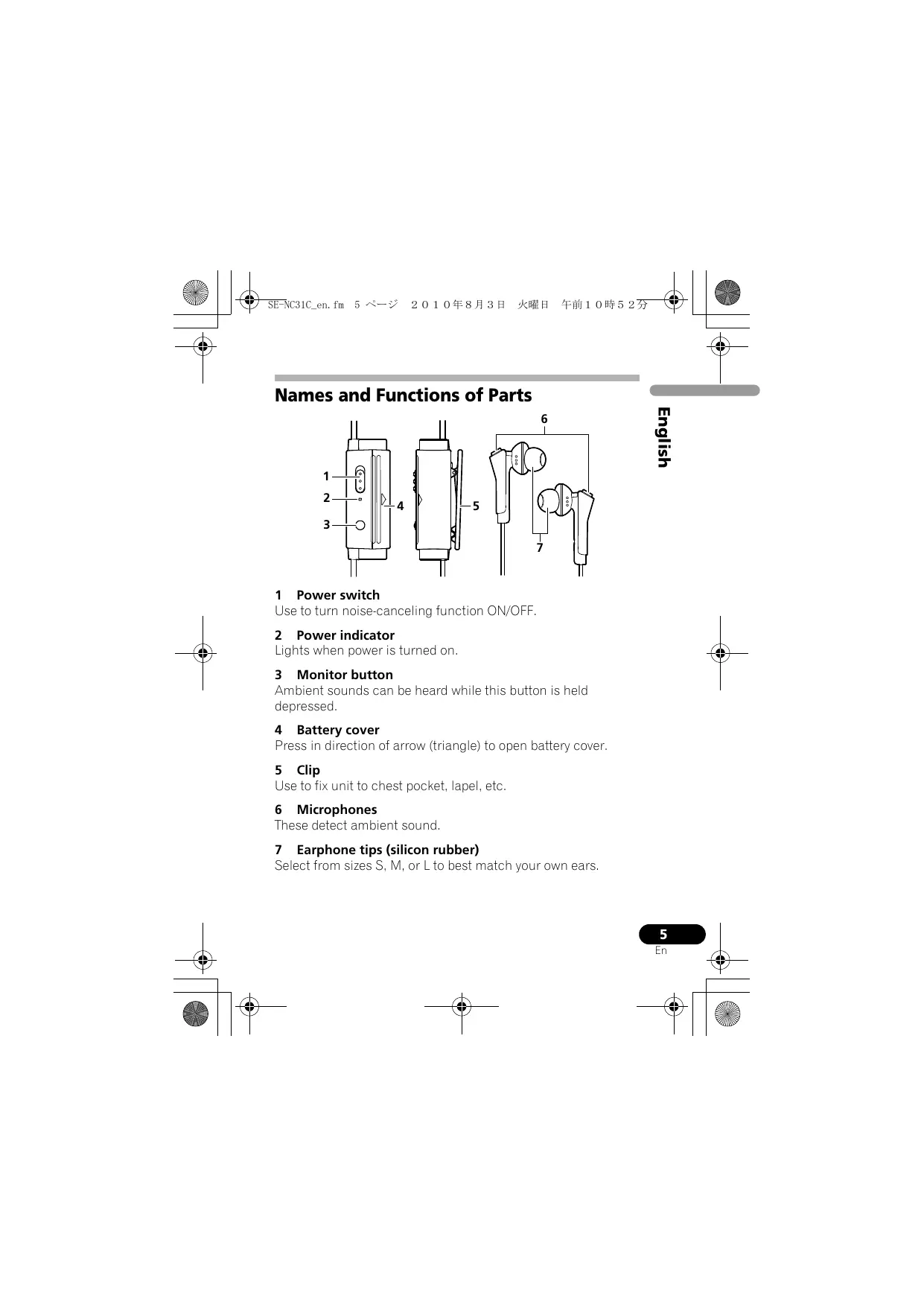 Use to turn noise-canceling function ON/OFF. 2 Power indicator Lights when power is turned on. 3 Monitor button Ambient sounds can be heard while this button is held depressed. 4 Battery cover Press in direction of arrow (triangle) to open battery cover. 5 Clip Use to fix unit to chest pocket, lapel, etc. 6 Microphones These detect ambient sound. 7 Earphone tips (silicon rubber) Select from sizes S, M, or L to best match your own ears.