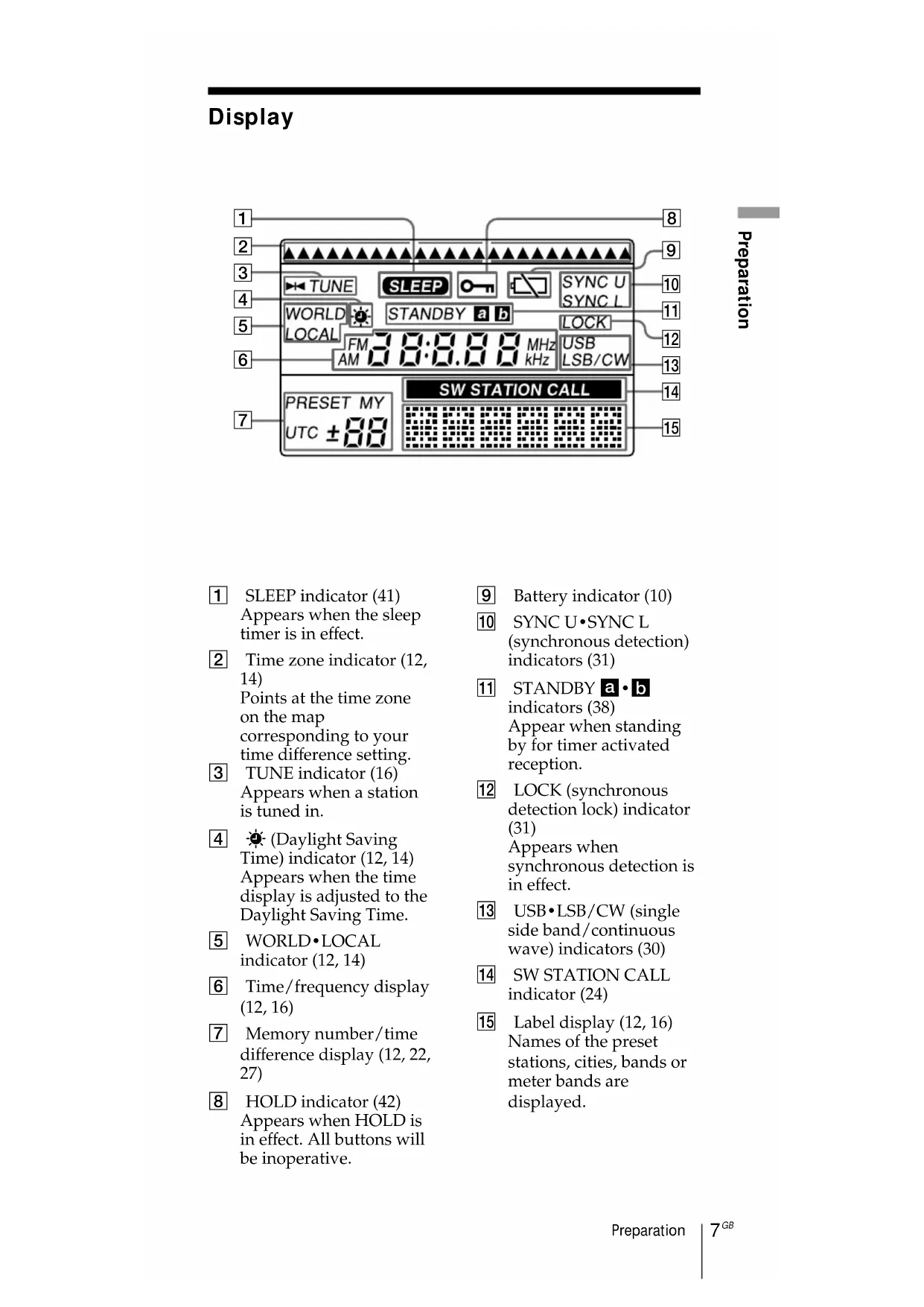Preparation Preparation Display 1 SLEEP indicator (41) Appears when the sleep timer is in effect. 2 Time zone indicator (12, 14) Points at the time zone on the map corresponding to your time difference setting. 3 TUNE indicator (16) Appears when a station is tuned in. 4 s (Daylight Saving Time) indicator (12, 14) Appears when the time display is adjusted to the Daylight Saving Time. 5 WORLD•LOCAL indicator (12, 14) 6 Time/frequency display (12, 16) 7 Memory number/time difference display (12, 22, 27) 8 HOLD indicator (42) Appears when HOLD is in effect. All buttons will be inoperative. 9 Battery indicator (10)