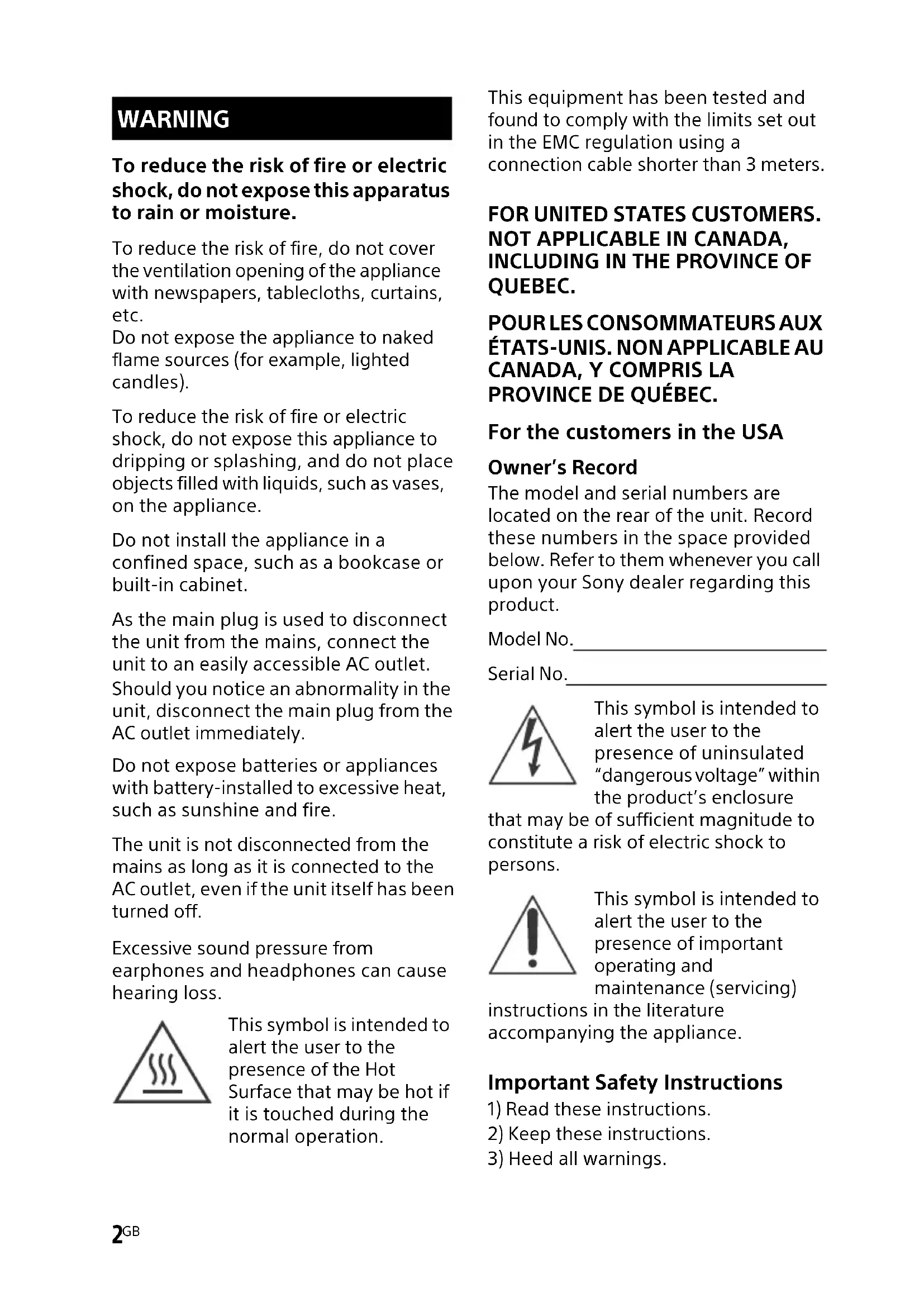 PROVINCE DE QUÉBEC. For the customers in the USA Owner’s Record The model and serial numbers are located on the rear of the unit. Record these numbers in the space provided below. Refer to them whenever you call upon your Sony dealer regarding this product. Model No. Serial No. This symbol is intended to alert the user to the presence of uninsulated “dangerous voltage” within the product’s enclosure that may be of sufficient magnitude to constitute a risk of electric shock to persons. This symbol is intended to alert the user to the presence of important operating and maintenance (servicing) instructions in the literature accompanying the appliance. Important Safety Instructions