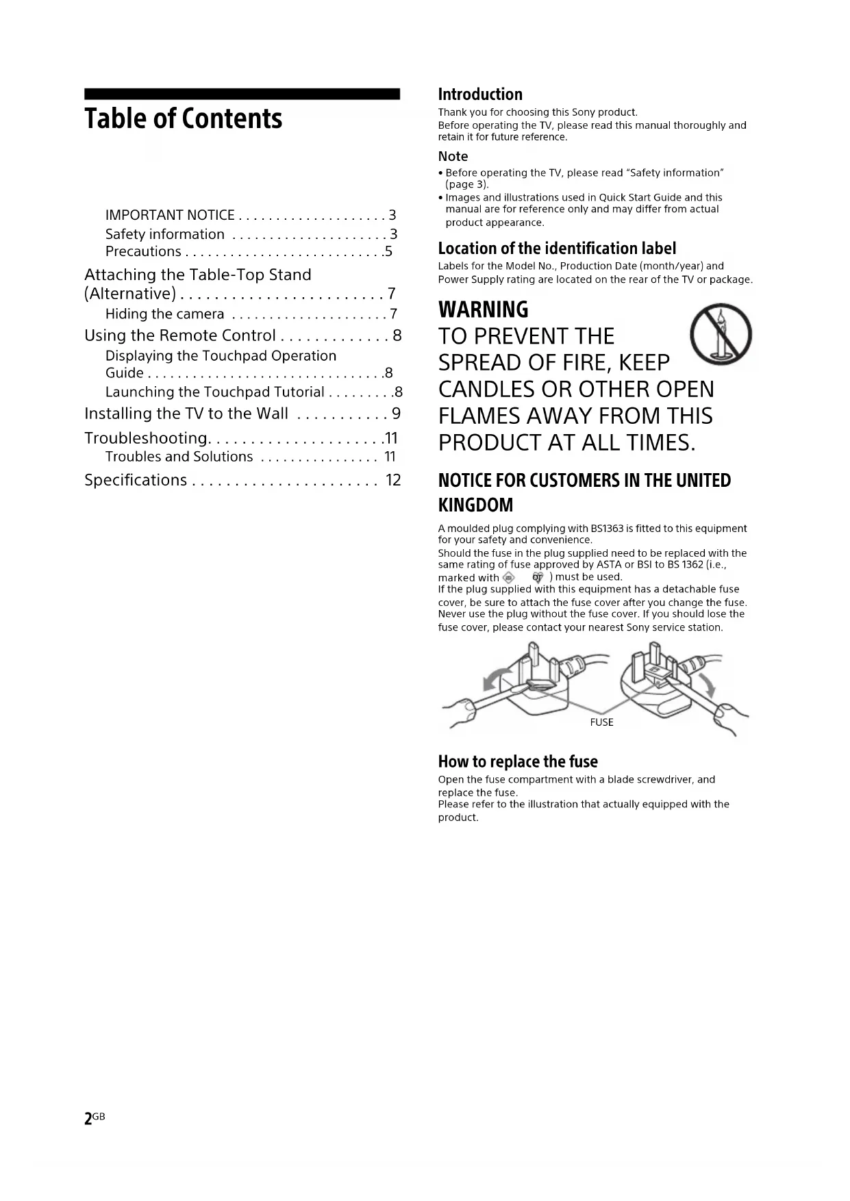KINGDOM A moulded plug complying with BS1363 is fitted to this equipment for your safety and convenience.Should the fuse in the plug supplied need to be replaced with the same rating of fuse approved by ASTA or BSI to BS 1362 (i.e., marked with or ) must be used.If the plug supplied with this equipment has a detachable fuse cover, be sure to attach the fuse cover after you change the fuse. Never use the plug without the fuse cover. If you should lose the fuse cover, please contact your nearest Sony service station. How to replace the fuse Open the fuse compartment with a blade screwdriver, and replace the fuse.Please refer to the illustration that actually equipped with the product. FUSE3