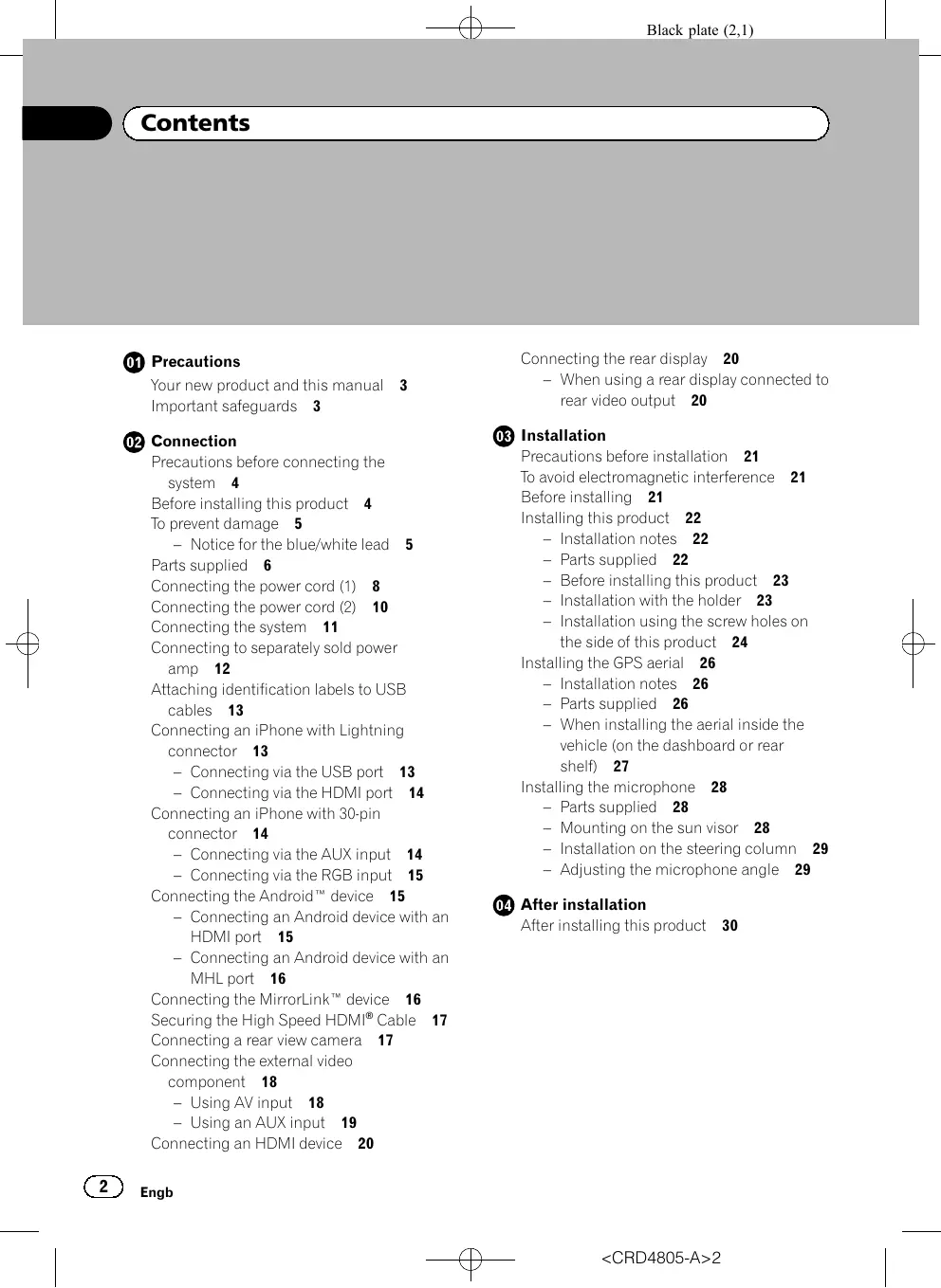 Connecting the rear display 20 – When using a rear display connected to rear video output 20 Installation Precautions before installation 21 To avoid electromagnetic interference 21 Before installing 21 Installing this product 22 – Installation notes 22 – Parts supplied 22 – Before installing this product 23 – Installation with the holder 23 – Installation using the screw holes on the side of this product 24 Installing the GPS aerial 26 – Installation notes 26 – Parts supplied 26 – When installing the aerial inside the vehicle (on the dashboard or rear shelf) 27 Installing the microphone 28 – Parts supplied 28 – Mounting on the sun visor 28 – Installation on the steering column 29 – Adjusting the microphone angle 29 After installation After installing this product 30 Engb <CRD4805-A>2 Black plate (3,1) Section Precautions