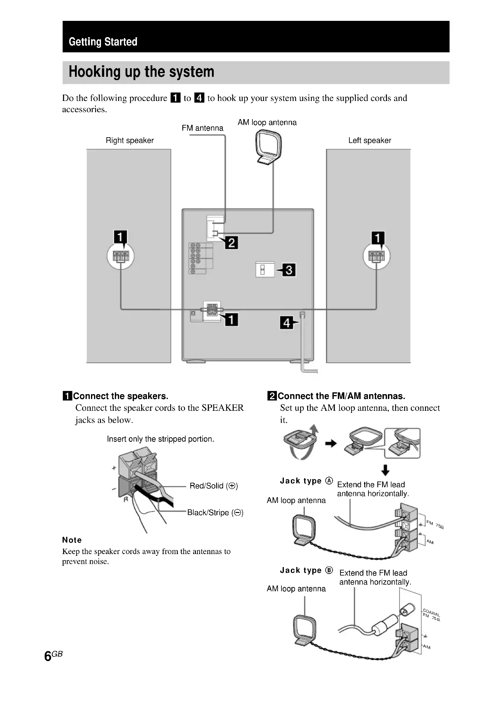 Getting Started Hooking up the system Do the following procedure 1 to 4 to hook up your system using the supplied cords and accessories. AM loop antennaFM antennaRight speakerLeft speaker 1 Connect the speakers. Connect the speaker cords to the SPEAKER jacks as below. Note Keep the speaker cords away from the antennas to prevent noise. Insert only the stripped portion.Black/Stripe (#)Red/Solid (3)Extend the FM leadantenna horizontally.AM loop antennaExtend the FM leadantenna horizontally.AM loop antennaJack type BJack type A 2 Connect the FM/AM antennas. Set up the AM loop antenna, then connect it.Getting Started