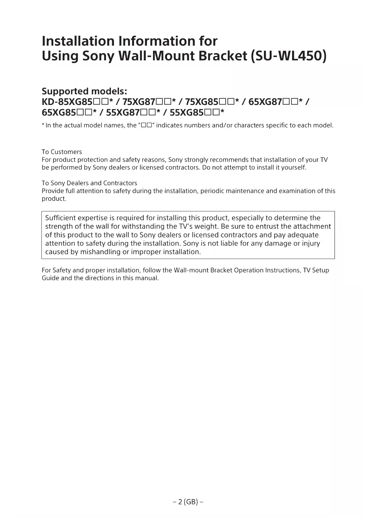 - In the actual model names, the “” indicates numbers and/or characters specific to each model. To Customers For product protection and safety reasons, Sony strongly recommends that installation of your TV be performed by Sony dealers or licensed contractors. Do not attempt to install it yourself. To Sony Dealers and Contractors Provide full attention to safety during the installation, periodic maintenance and examination of this product. Sufficient expertise is required for installing this product, especially to determine the strength of the wall for withstanding the TV’s weight. Be sure to entrust the attachment of this product to the wall to Sony dealers or licensed contractors and pay adequate attention to safety during the installation. Sony is not liable for any damage or injury caused by mishandling or improper installation. For Safety and proper installation, follow the Wall-mount Bracket Operation Instructions, TV Setup Guide and the directions in this manual.− 3 (GB) −