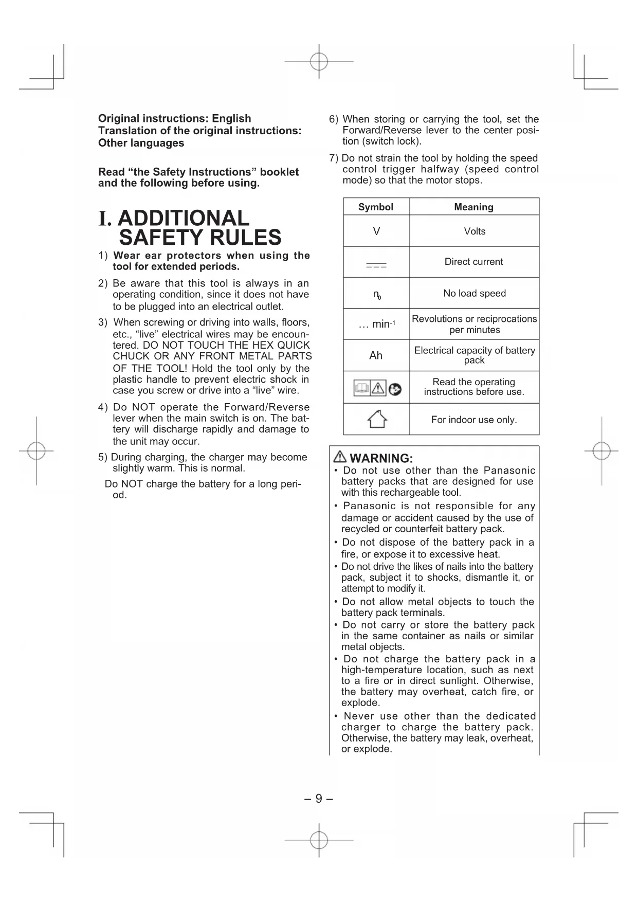 - Do not use other than the Panasonic battery packs that are designed for use with this rechargeable tool.