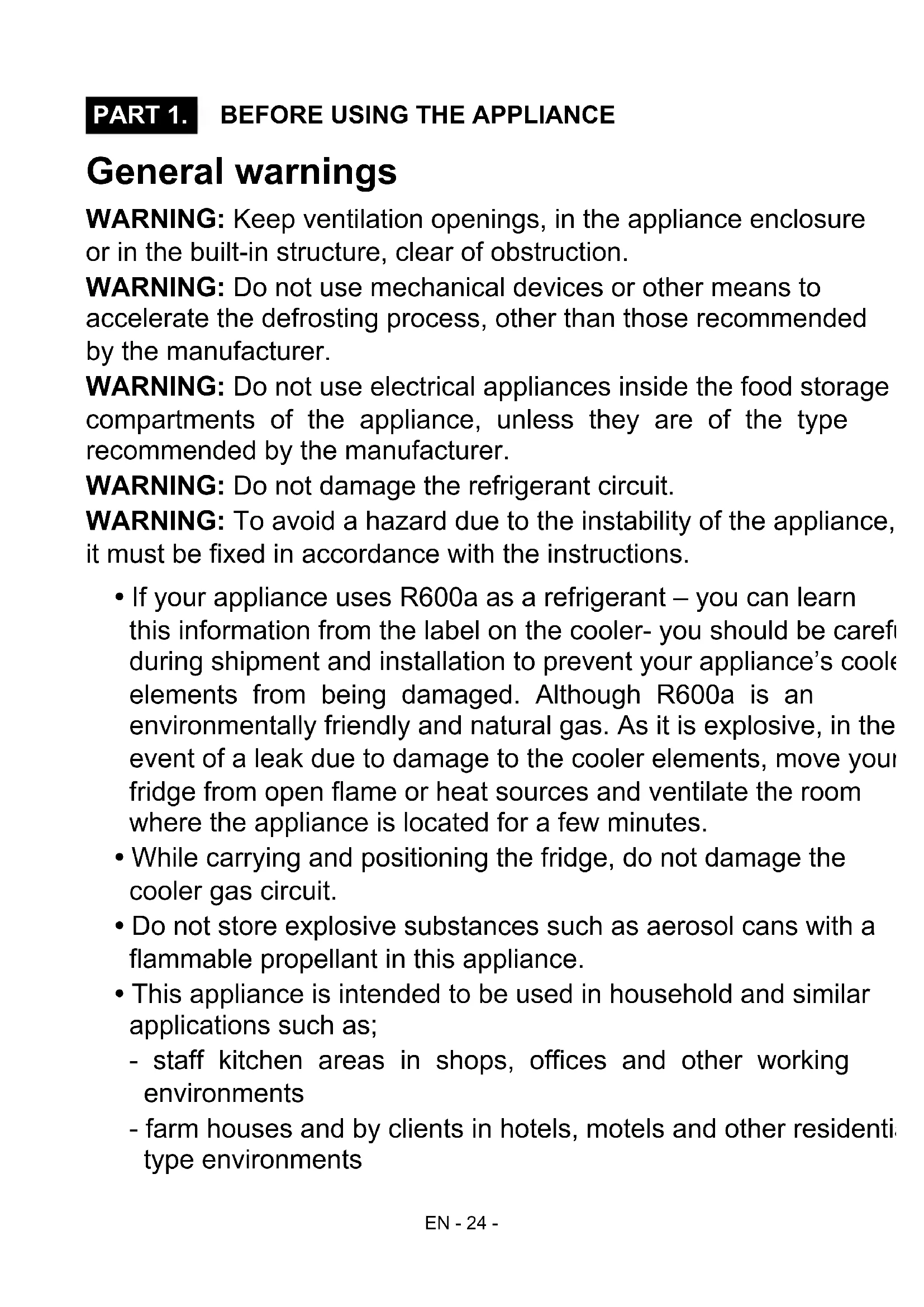 PART 1. BEFORE USING THE APPLIANCE