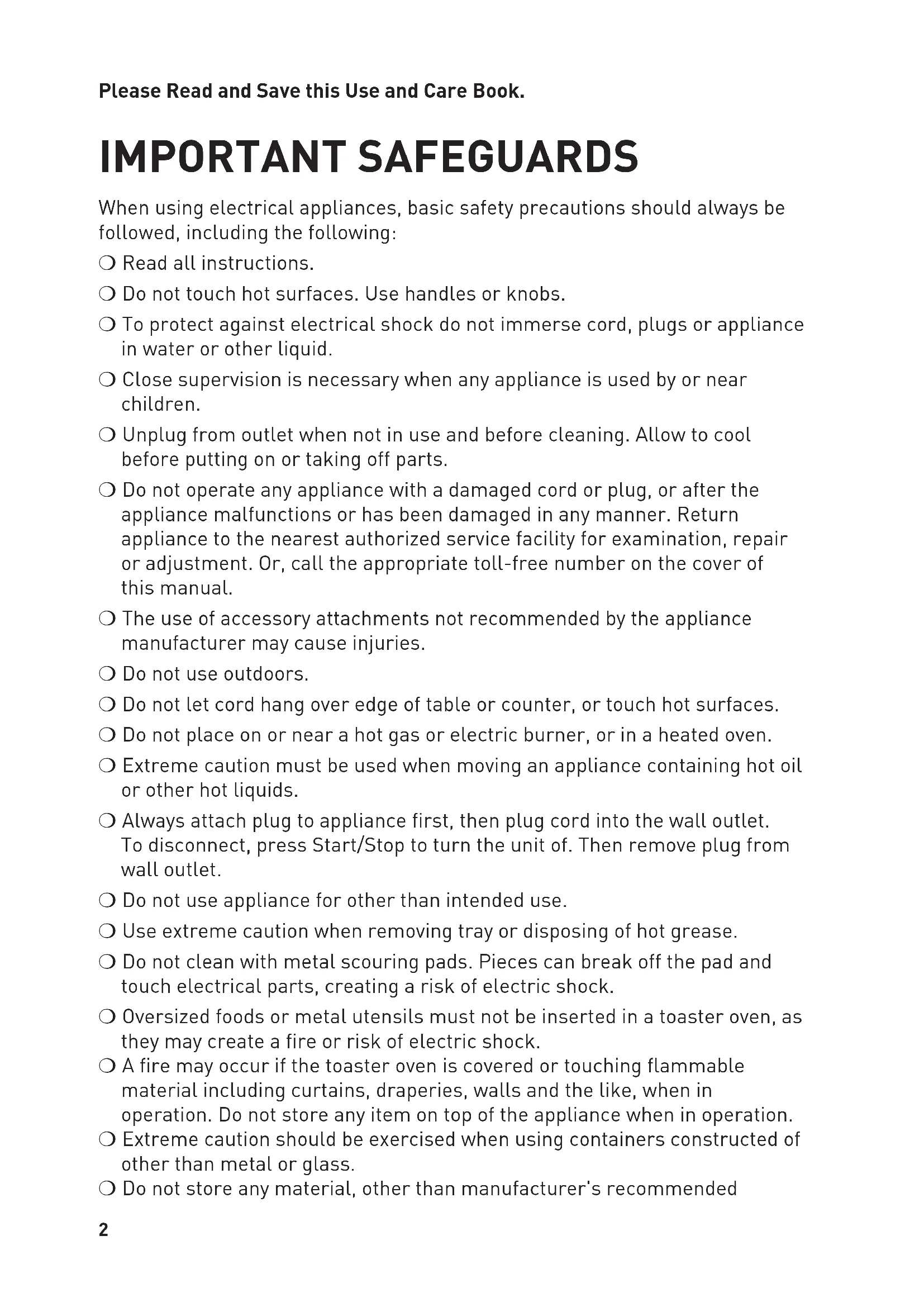 O Oversized foods or metal utensils must not be inserted in a toaster oven, as they may create a fire or risk of electric shock.