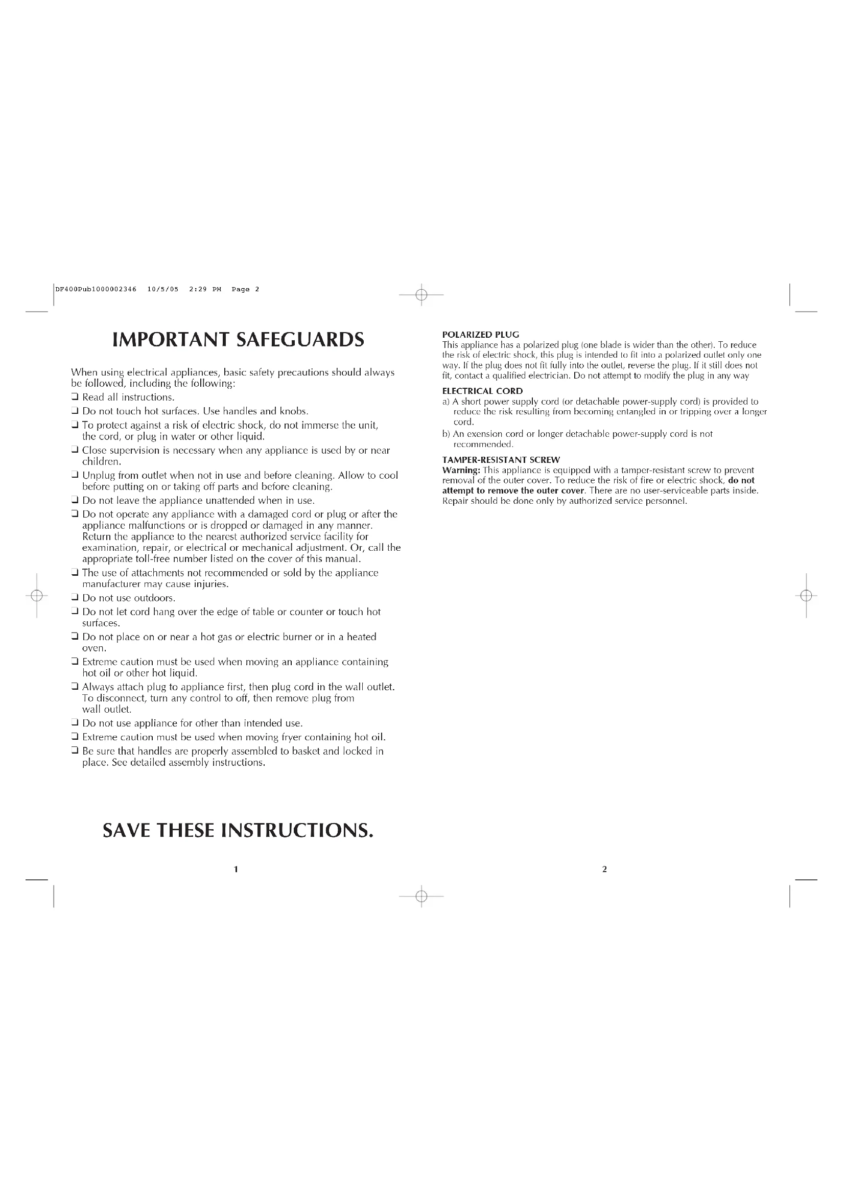 Be sure that handles are properly assembled to basket and locked in place. See detailed assembly instructions. IMPORTANT SAFEGUARDS SAVE THESE INSTRUCTIONS. POLARIZED PLUG This appliance has a polarized plug (one blade is wider than the other). To reduce the risk of electric shock, this plug is intended to fit into a polarized outlet only one way. If the plug does not fit fully into the outlet, reverse the plug. If it still does not fit, contact a qualified electrician. Do not attempt to modify the plug in any way ELECTRICAL CORD a) A short power supply cord (or detachable power-supply cord) is provided to reduce the risk resulting from becoming entangled in or tripping over a longer cord. b) An exension cord or longer detachable power-supply cord is not recommended. TAMPER-RESISTANT SCREW