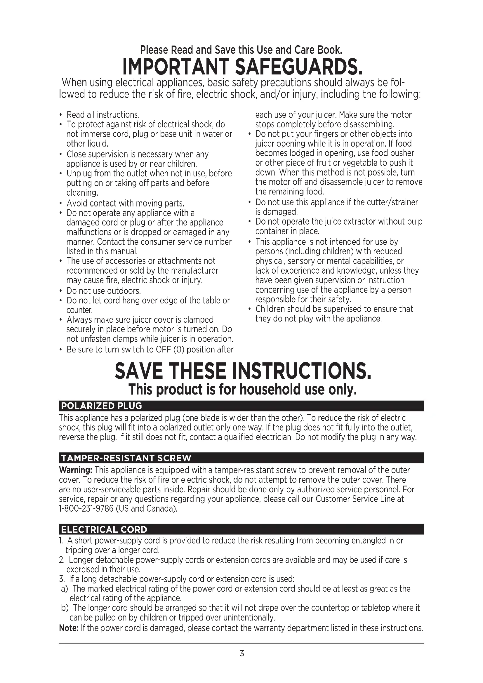 Warning: This appliance is equipped with a tamper-resistant screw to prevent removal of the outer cover. To reduce the risk of fire or electric shock, do not attempt to remove the outer cover. There are no user-serviceable parts inside. Repair should be done only by authorized service personnel. For service, repair or any questions regarding your appliance, please call our Customer Service Line at 1-800-231-9786 (US and Canada).