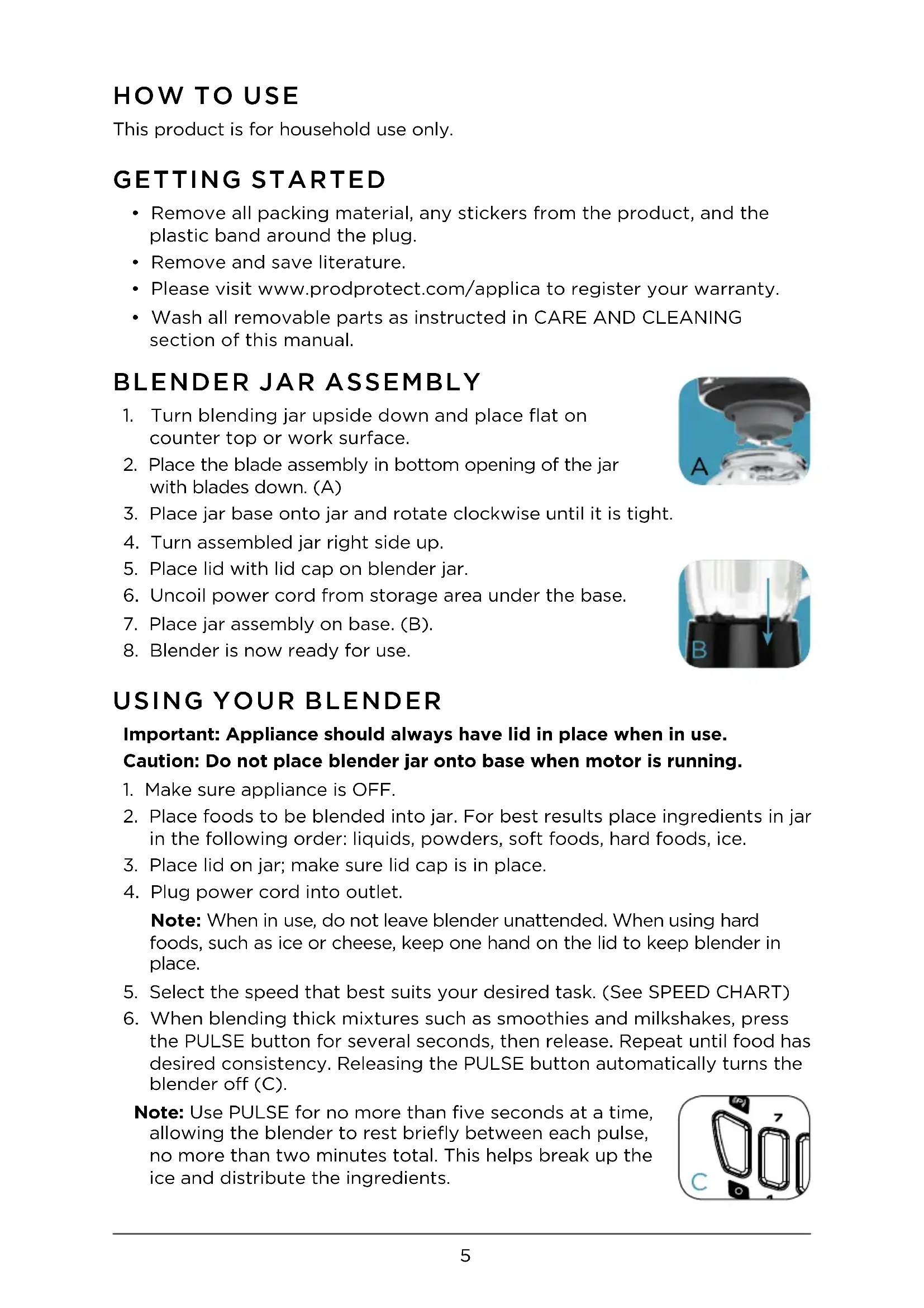 Note: When in use, do not leave blender unattended. When using hard foods, such as ice or cheese, keep one hand on the lid to keep blender in place.