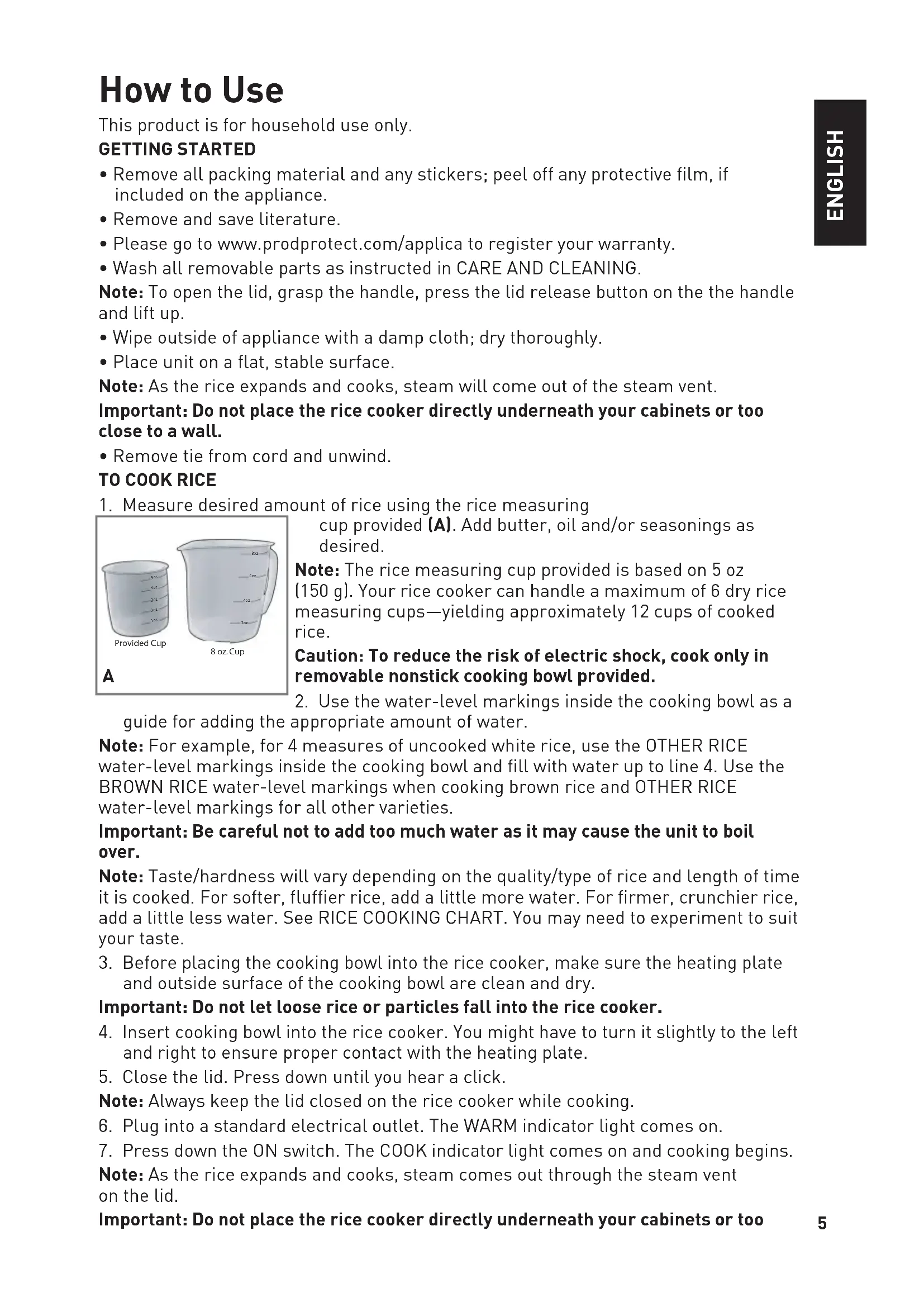 Note: As the rice expands and cooks, steam comes out through the steam vent on the lid. Important: Do not place the rice cooker directly underneath your cabinets or too ENGLISH 8 oz. Cup Provided Cup 8oz 6oz 4oz 2oz 1oz 2oz 3oz 4oz 5oz