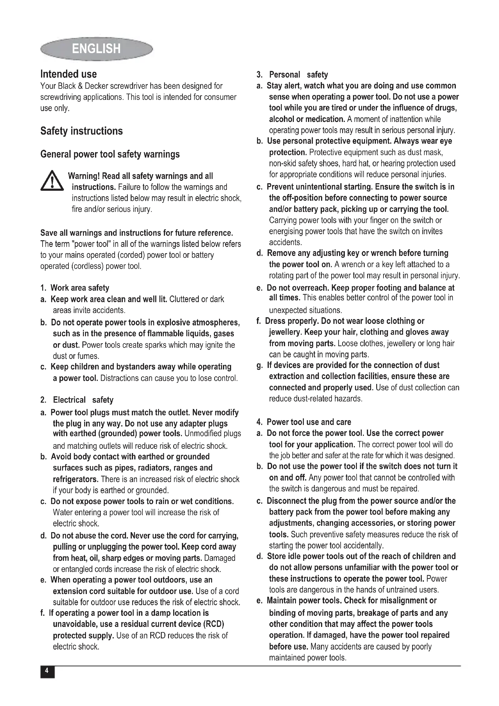 4. Power tool use and care