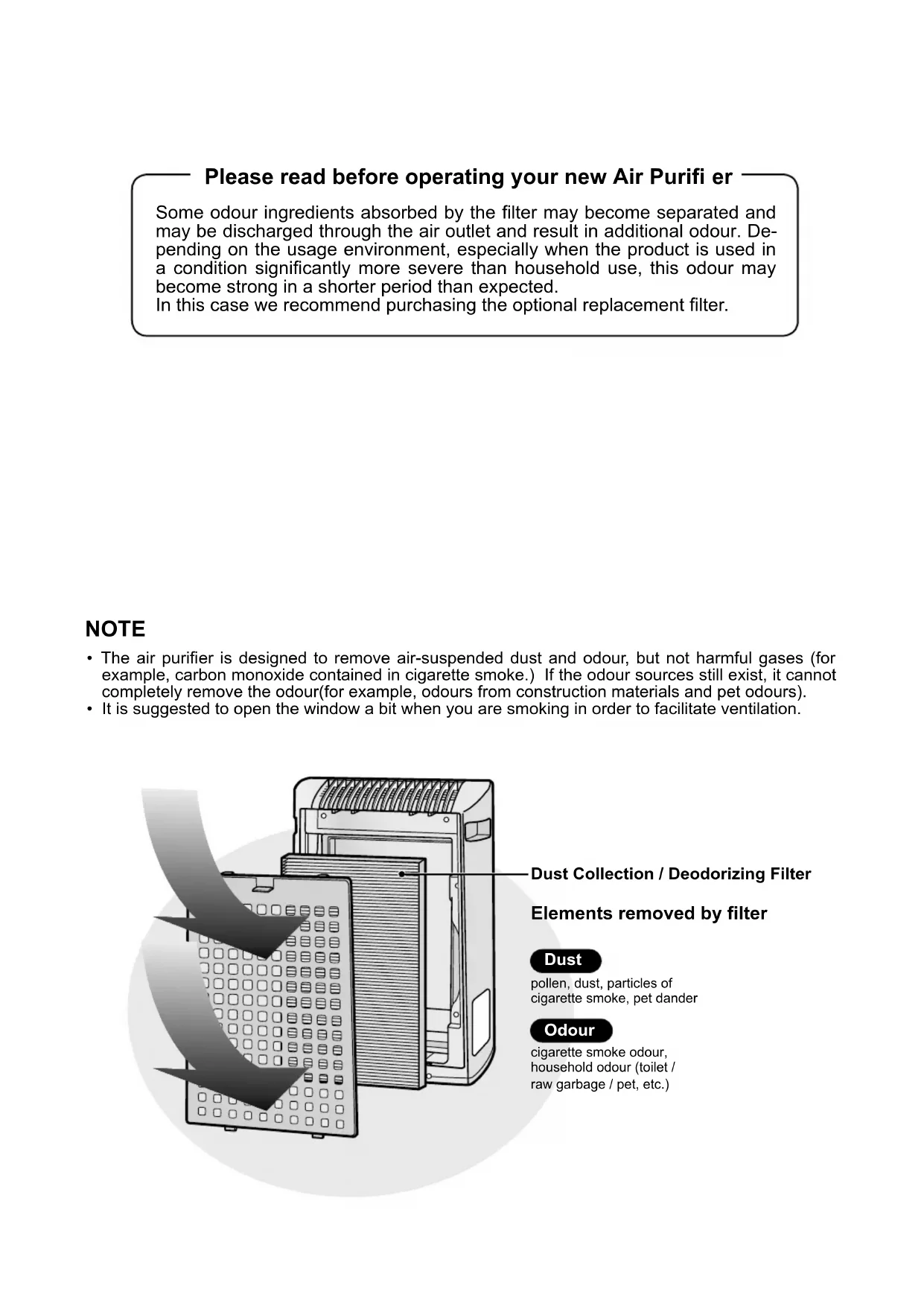 - The air purifi er is designed to remove air-suspended dust and odour, but not harmful gases (for example, carbon monoxide contained in cigarette smoke.) If the odour sources still exist, it cannot completely remove the odour(for example, odours from construction materials and pet odours).