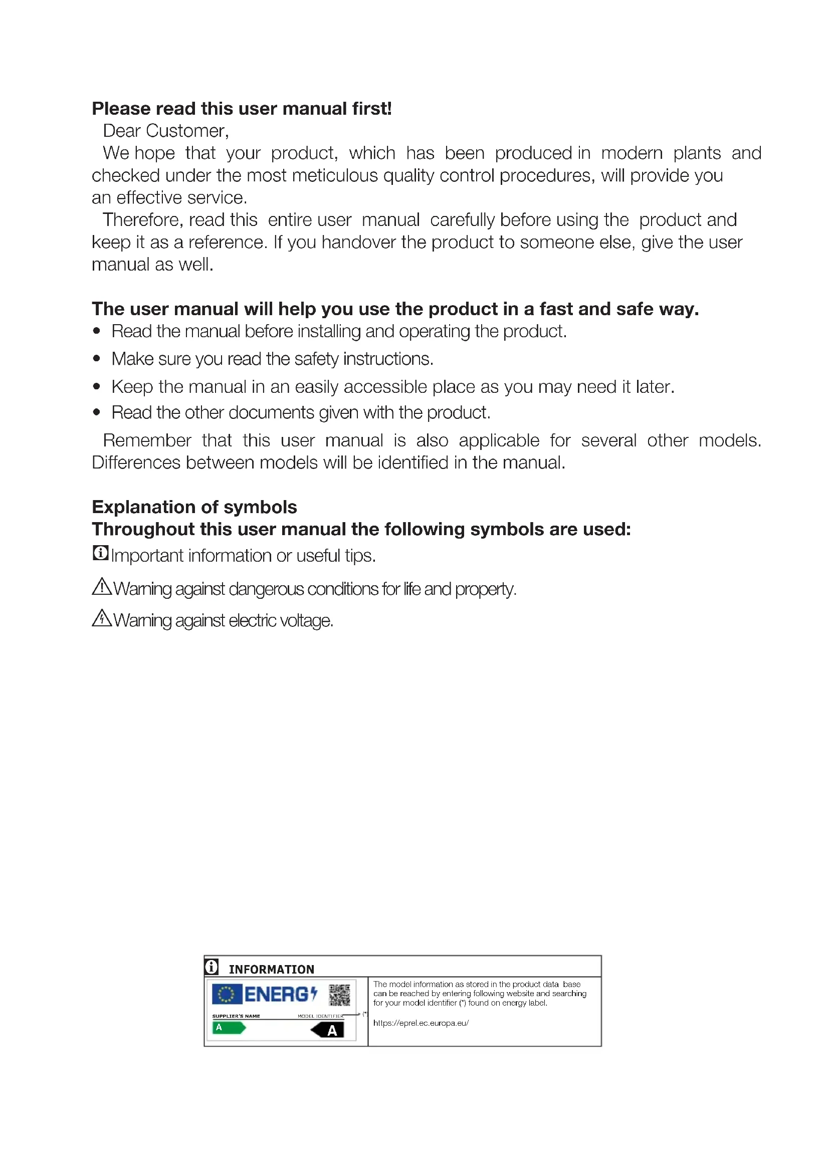 NLPlease read this user manual first! Dear Customer, We hope that your product, which has been produced in modern plants and checked under the most meticulous quality control procedures, will provide you an effective service. Therefore, read this entire user manual carefully before using the product and keep it as a reference. If you handover the product to someone else, give the user manual as well. The user manual will help you use the product in a fast and safe way.