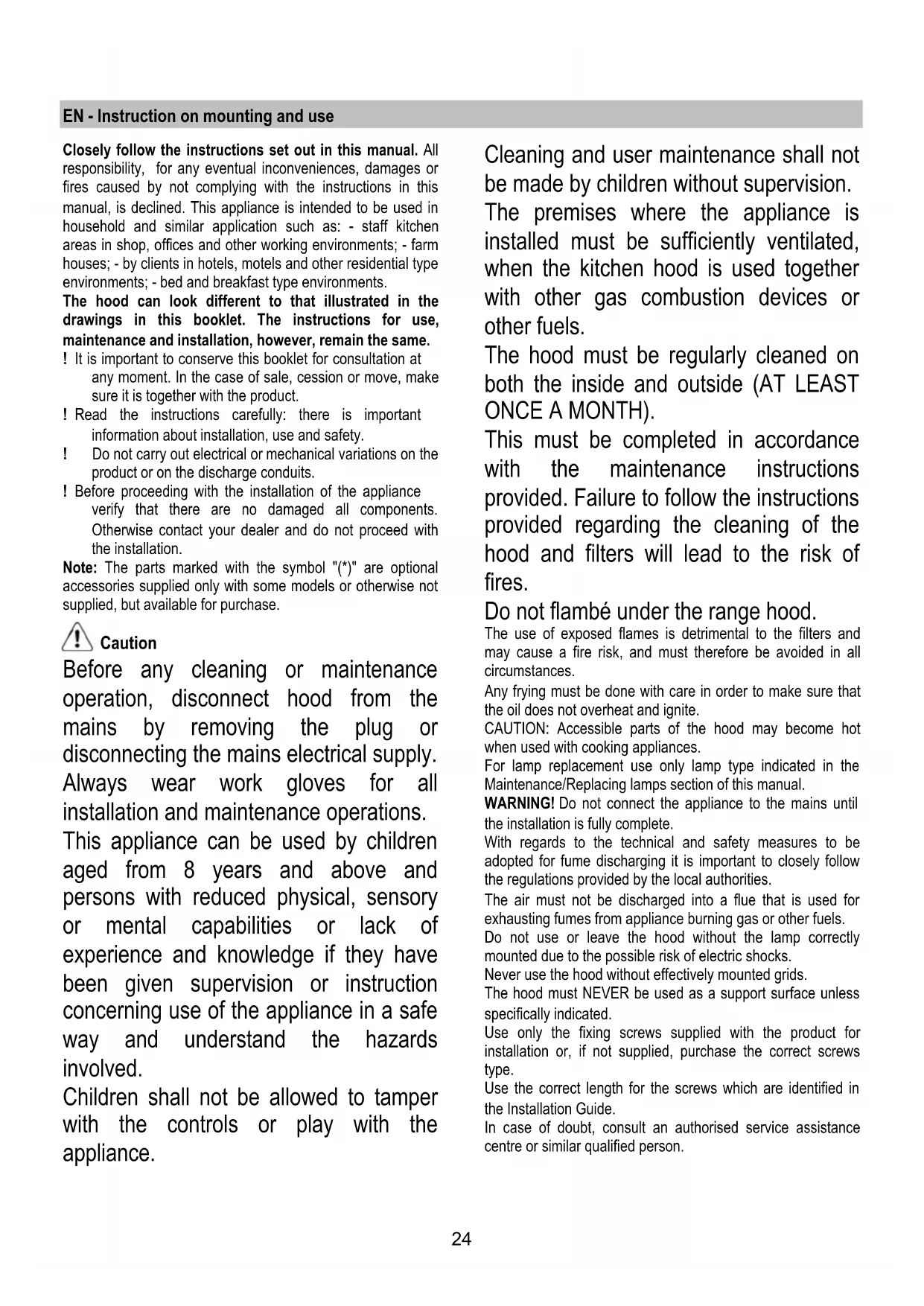 Dans l’éventualité où l’éclairage ne devait pas fonctionner, vérifier si les lampes ont été introduites correctement dans leur logement, avant de contacter le service après-vente. - Modèle avec lampes LED La hotte est dotée d’un système d’éclairage basé sur la technologie LED. Les LEDS garantissent un éclairage optimal, une durée jusqu’à 10 fois supérieures aux ampoules traditionnelles et permettent une épargne de 90% en énergie électrique. Pour le remplacement, s’adresser au service d’assistance technique.24 EN - Instruction on mounting and use Closely follow the instructions set out in this manual. All responsibility, for any eventual inconveniences, damages or fires caused by not complying with the instructions in this manual, is declined. This appliance is intended to be used in household and similar application such as: - staff kitchen areas in shop, offices and other working environments; - farm houses; - by clients in hotels, motels and other residential type environments; - bed and breakfast type environments. The hood can look different to that illustrated in the drawings in this booklet. The instructions for use, maintenance and installation, however, remain the same. ! It is important to conserve this booklet for consultation at any moment. In the case of sale, cession or move, make sure it is together with the product. ! Read the instructions carefully: there is important information about installation, use and safety. ! Do not carry out electrical or mechanical variations on the product or on the discharge conduits. ! Before proceeding with the installation of the appliance verify that there are no damaged all components. Otherwise contact your dealer and do not proceed with the installation. Note: The parts marked with the symbol "(*)" are optional accessories supplied only with some models or otherwise not supplied, but available for purchase. Caution Before any cleaning or maintenance operation, disconnect hood from the mains by removing the plug or disconnecting the mains electrical supply. Always wear work gloves for all installation and maintenance operations. This appliance can be used by children aged from 8 years and above and persons with reduced physical, sensory or mental capabilities or lack of experience and knowledge if they have been given supervision or instruction concerning use of the appliance in a safe way and understand the hazards involved. Children shall not be allowed to tamper with the controls or play with the appliance. Cleaning and user maintenance shall not be made by children without supervision. The premises where the appliance is installed must be sufficiently ventilated, when the kitchen hood is used together with other gas combustion devices or other fuels. The hood must be regularly cleaned on both the inside and outside (AT LEAST ONCE A MONTH). This must be completed in accordance with the maintenance instructions provided. Failure to follow the instructions provided regarding the cleaning of the hood and filters will lead to the risk of fires. Do not flambé under the range hood. The use of exposed flames is detrimental to the filters and may cause a fire risk, and must therefore be avoided in all circumstances. Any frying must be done with care in order to make sure that the oil does not overheat and ignite. CAUTION: Accessible parts of the hood may become hot when used with cooking appliances. For lamp replacement use only lamp type indicated in the Maintenance/Replacing lamps section of this manual. WARNING! Do not connect the appliance to the mains until the installation is fully complete. With regards to the technical and safety measures to be adopted for fume discharging it is important to closely follow the regulations provided by the local authorities. The air must not be discharged into a flue that is used for exhausting fumes from appliance burning gas or other fuels. Do not use or leave the hood without the lamp correctly mounted due to the possible risk of electric shocks. Never use the hood without effectively mounted grids. The hood must NEVER be used as a support surface unless specifically indicated. Use only the fixing screws supplied with the product for installation or, if not supplied, purchase the correct screws type. Use the correct length for the screws which are identified in the Installation Guide. In case of doubt, consult an authorised service assistance centre or similar qualified person.25 WARNING! Failure to install the screws or fixing device in accordance with these instructions may result in electrical hazards. Do not use with a programmer, timer, separate remote control system or any other device that switches on automatically. This appliance is marked according to the European directive 2012/19/EC on Waste Electrical and Electronic Equipment (WEEE). By ensuring this product is disposed of correctly, you will help prevent potential negative consequences for the environment and human health, which could otherwise be caused by inappropriate waste handling of this product. The symbol on the product, or on the documents accompanying the product, indicates that this appliance may not be treated as household waste. Instead it should be taken to the appropriate collection point for the recycling of electrical and electronic equipment. Disposal must be carried out in accordance with local environmental regulations for waste disposal. For further detailed information regarding the process, collection and recycling of this product, please contact the appropriate department of your local authorities or the local department for household waste or the shop where you purchased this product. Appliance designed, tested and manufactured according to: