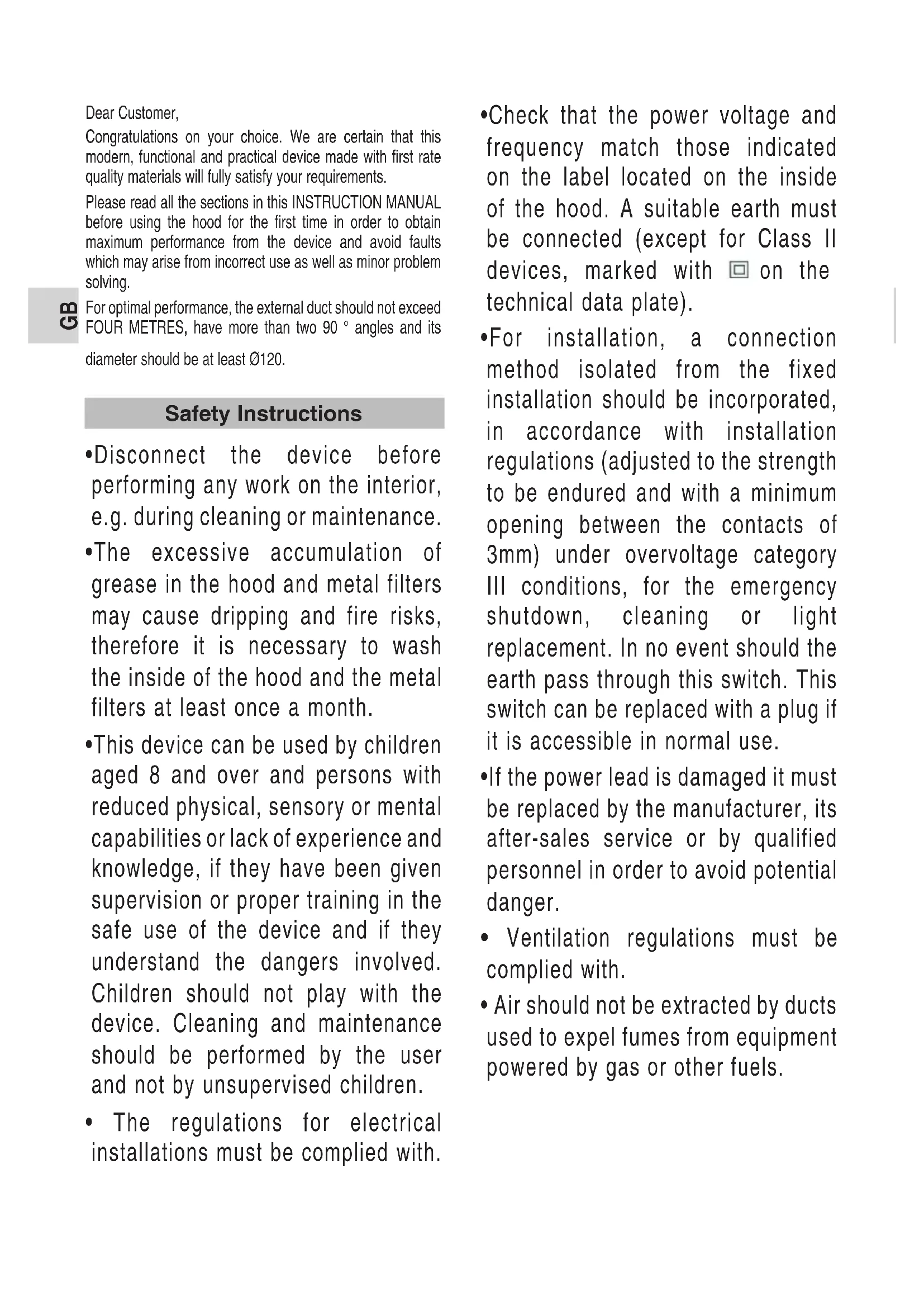 - Air should not be extracted by ducts used to expel fumes from equipment powered by gas or other fuels. Safety Instructions•The room must be adequately ventilated when the hood will be used simultaneously with equipment powered by energy other than electricity e.g. gas cookers.