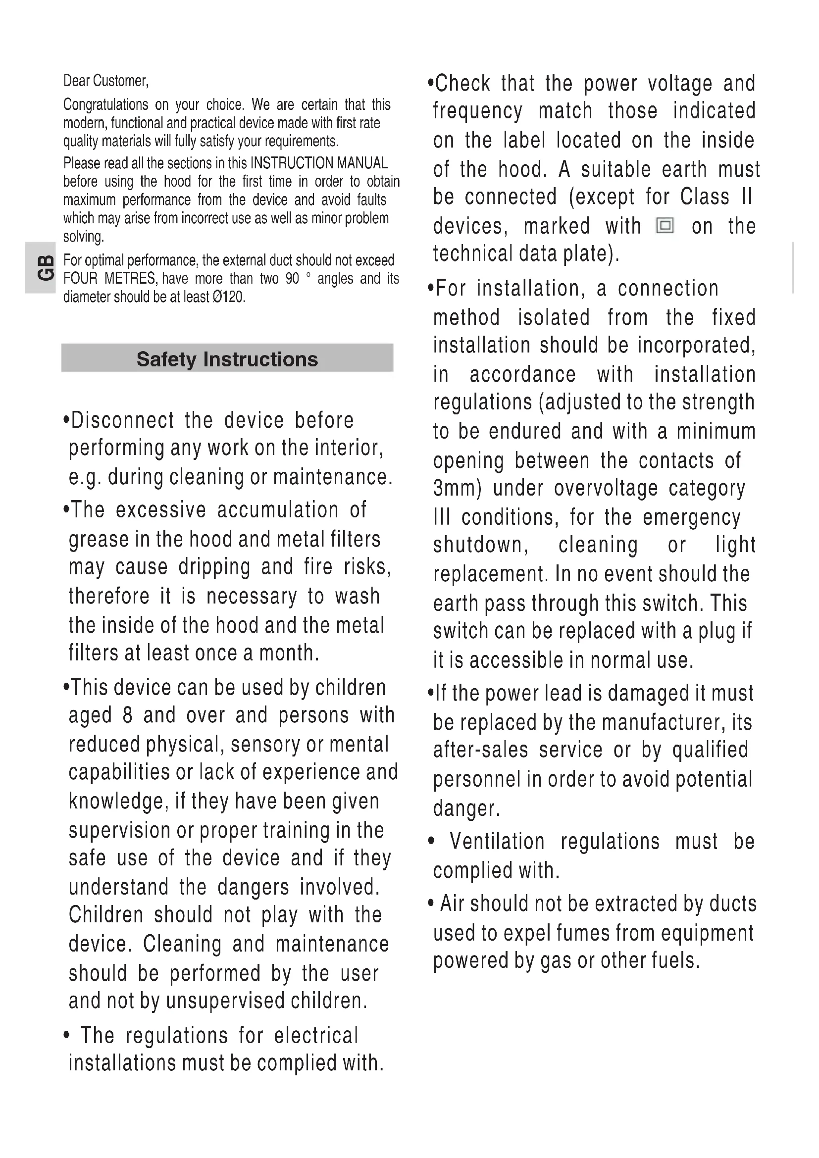- Air should not be extracted by ducts used to expel fumes from equipment powered by gas or other fuels. Safety InstructionsGB