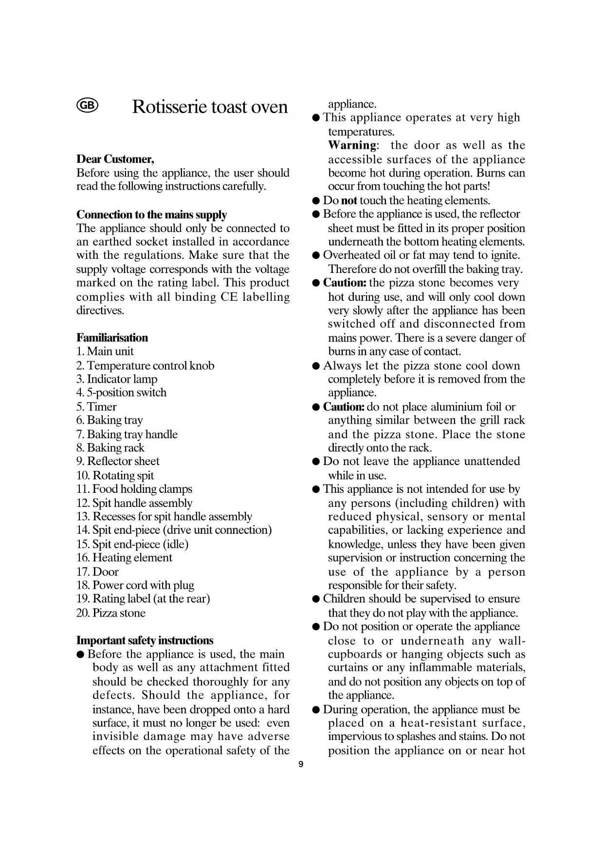 accessible surfaces of the appliance become hot during operation. Burns can occur from touching the hot parts! ● Do not touch the heating elements. ● Before the appliance is used, the reflector sheet must be fitted in its proper position underneath the bottom heating elements. ● Overheated oil or fat may tend to ignite. Therefore do not overfill the baking tray. ● Caution: the pizza stone becomes very hot during use, and will only cool down very slowly after the appliance has been switched off and disconnected from mains power. There is a severe danger of burns in any case of contact. ● Always let the pizza stone cool down completely before it is removed from the appliance. ● Caution: do not place aluminium foil or anything similar between the grill rack and the pizza stone. Place the stone directly onto the rack. ● Do not leave the appliance unattended while in use. ● This appliance is not intended for use by any persons (including children) with reduced physical, sensory or mental capabilities, or lacking experience and knowledge, unless they have been given supervision or instruction concerning the use of the appliance by a person responsible for their safety. ● Children should be supervised to ensure that they do not play with the appliance. ● Do not position or operate the appliance close to or underneath any wall- cupboards or hanging objects such as curtains or any inflammable materials, and do not position any objects on top of the appliance. ● During operation, the appliance must be placed on a heat-resistant surface, impervious to splashes and stains. Do not position the appliance on or near hot Rotisserie toast oven