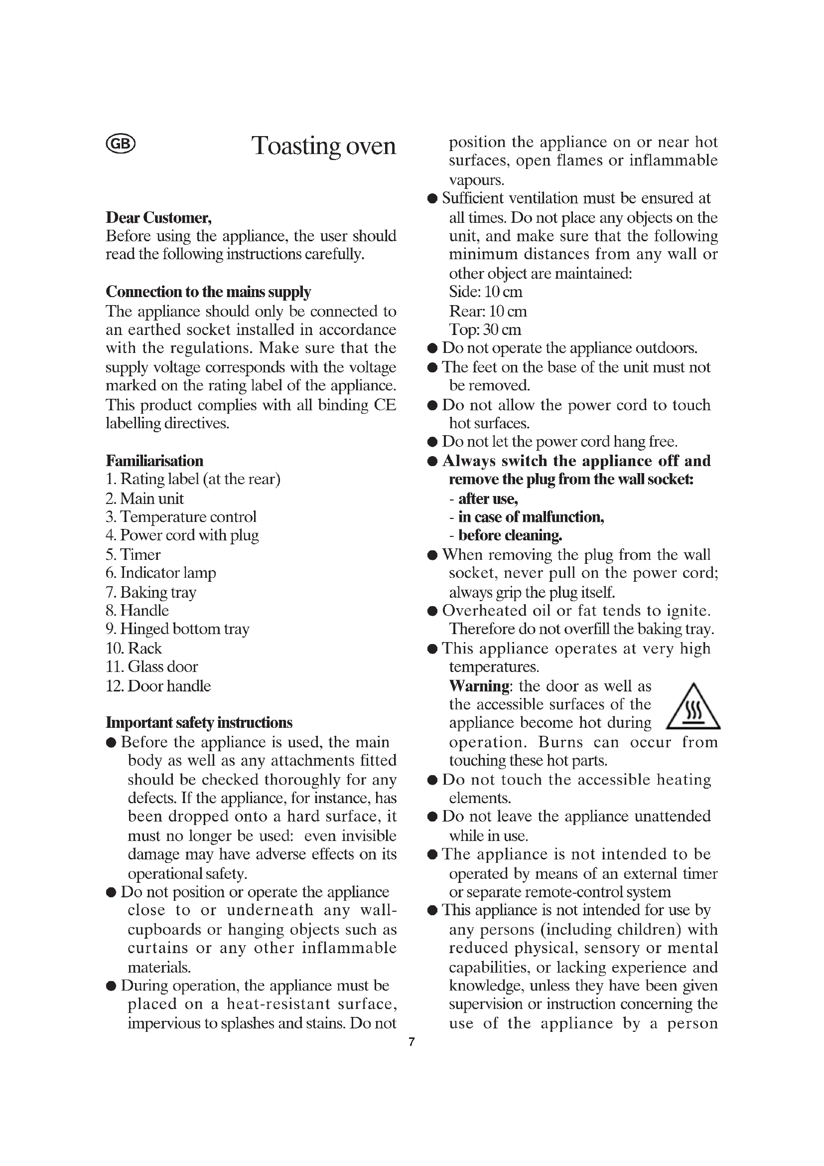 Toasting oven responsible for their safety. ● Children should be supervised to ensure that they do not play with the appliance. ● No responsibility will be accepted if damage results from improper use, or if these instructions are not complied with. ● This appliance is intended for domestic use only and not for commercial applications. ● In order to comply with safety regulations and to avoid hazards, repairs of electrical appliances must be carried out by qualified personnel, including the replacement of the power cord. If repairs are needed, please send the appliance to one of our customer service departments. The address can be found in the appendix to this manual. Before using for the first time