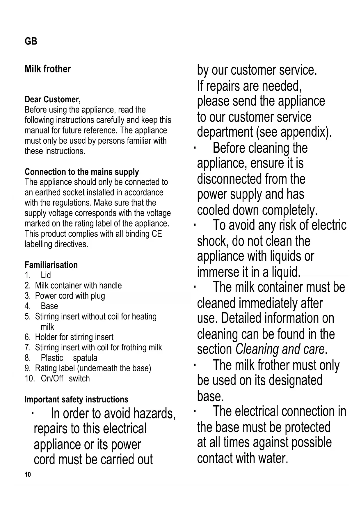 Important safety instructions ∙ In order to avoid hazards, repairs to this electrical appliance or its power cord must be carried out by our customer service. If repairs are needed, please send the appliance to our customer service department (see appendix). ∙ Before cleaning the appliance, ensure it is disconnected from the power supply and has cooled down completely. ∙ To avoid any risk of electric shock, do not clean the appliance with liquids or immerse it in a liquid. ∙ The milk container must be cleaned immediately after use. Detailed information on cleaning can be found in the section Cleaning and care. ∙ The milk frother must only be used on its designated base. ∙ The electrical connection in the base must be protected at all times against possible contact with water. GB11 ∙ Always use the milk container handle, as the surface may be hot during and after operation. ∙ Caution: Any misuse can cause severe personal injury. ∙ This appliance is intended for domestic or similar applications, such as the - staff kitchens in shops, offi ces and other similar working environments, - agricultural working environments, - by customers in hotels, motels etc. and similar accommodation, - in bed-and breakfast type environments. ∙ This appliance may be used by children (at least 8 years of age) and by persons with reduced physical, sensory or mental capabilities, or lacking experience and knowledge, provided they have been given supervision or instruction concerning the use of the appliance and fully understand all dangers and safety precautions involved. ∙ Children must not be permitted to play with the appliance. ∙ Children must not be permitted to carry out any cleaning or maintenance work on the appliance unless they are supervised and at least 8 years of age. ∙ The appliance and its power cord must be kept well away from children under 8 at all times. ∙ Caution: Keep any packaging materials well away from children – such materials are a potential source of danger, e.g. of suffocation. ∙ Every time the appliance is used, the main body including the power cord as well as any attachment fi tted should be checked thoroughly for any defects. Should the appliance, for instance, have12 been dropped onto a hard surface, or if excessive force has been used to pull the power cord, it must no longer be used: even invisible damage may have adverse effects on the operational safety of the appliance. ∙ This appliance is solely designed for heating up and frothing milk. Do not put any other type of liquid or solid food in the container. ∙ Do not leave the milk frother unattended while in use. ∙ Always observe the maximum level marks inside the container for each application. If there is not enough milk, the appliance may overheat. ∙ To prevent such overheating, the appliance will automatically switch off if it is operated when empty. If this occurs, the indicator light will go out. Remove the plug from the socket and allow the appliance to cool down. ∙ Overfi lling the container may cause danger if frothing milk is forced out. ∙ Caution: The lid must always be fi tted during operation; it should only be taken off to add cocoa powder or the like. ∙ The appliance may only be used with the original accessory parts provided by the manufacturer. ∙ The appliance must always be set on a fi rm, level surface. ∙ Do not allow the appliance or its power cord to come into contact with open fl ames or any hot surfaces such as hot- plates. ∙ Do not allow the power cord to hang free; the cord must be kept well away from hot parts of the appliance. ∙ Always remove the plug from the wall socket - in case of any malfunction, - after use, - before cleaning the appliance. ∙ When removing the plug from the wall socket, never pull on the power cord; always grip the plug itself. ∙ No responsibility is accepted if damage results from improper use, or if these instructions are not complied with. Before using for the fi rst time Remove any packaging materials and check that all components are present. Before the appliance is used for the fi rst time, or after extended periods of non-use, it should be thoroughly cleaned as described in the section Cleaning and care. Operation ∙ We recommend using milk with a high protein content. For best results, the milk should be taken from the refrigerator immediately before frothing. ∙ Always ensure that the contact surface between the base and the milk container is clean and dry. Selecting the stirring insert ∙ To froth milk, fi t the stirring insert with the coil onto the shaft of the holder, with the fl at side facing downwards.