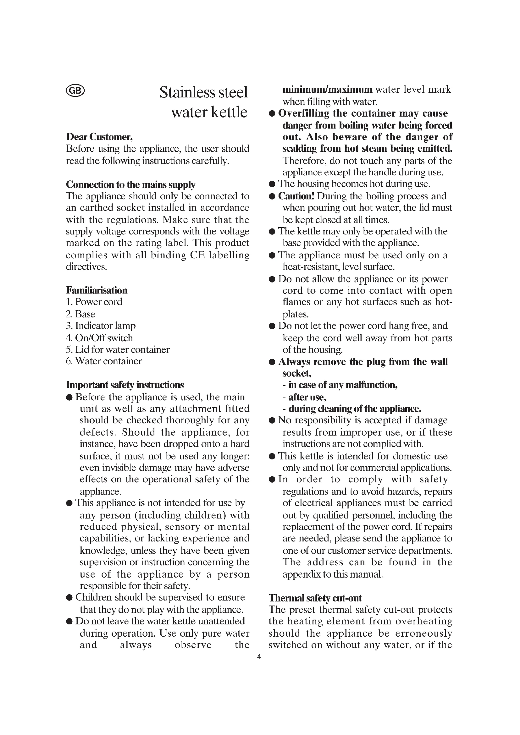 heating element is calcified. Once the safety cut-out has switched off the kettle, it must be allowed to cool down sufficiently, or must be descaled before it is switched on again.
