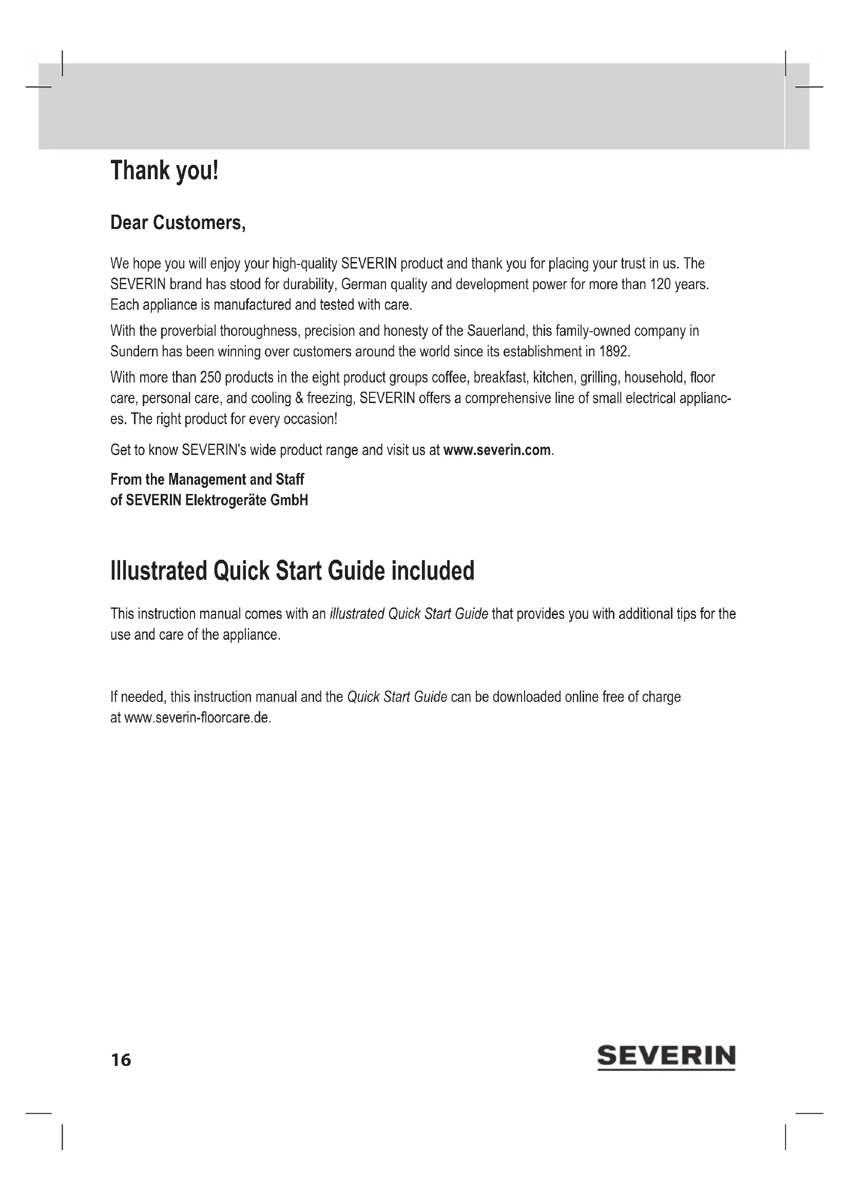 If needed, this instruction manual and the Quick Start Guide can be downloaded online free of charge at www.severin-floorcare.de.